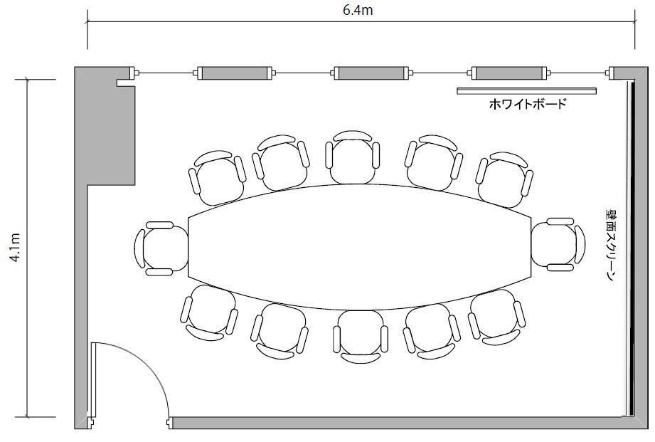※固定卓のお部屋となります。 ※ホワイトボード1台、壁面スクリーンが備え付けとなっております。 ※有線・無線共にインターネットがご使用いただけます。 通信速度に関しては、回線の混雑状況により繋がらない事や速度低下が発生することがあります。