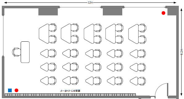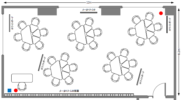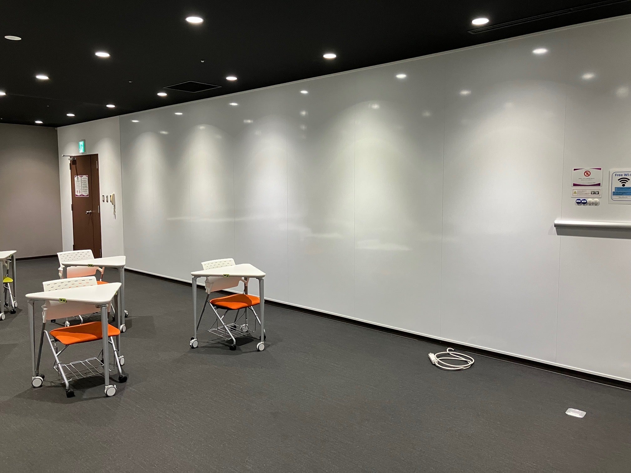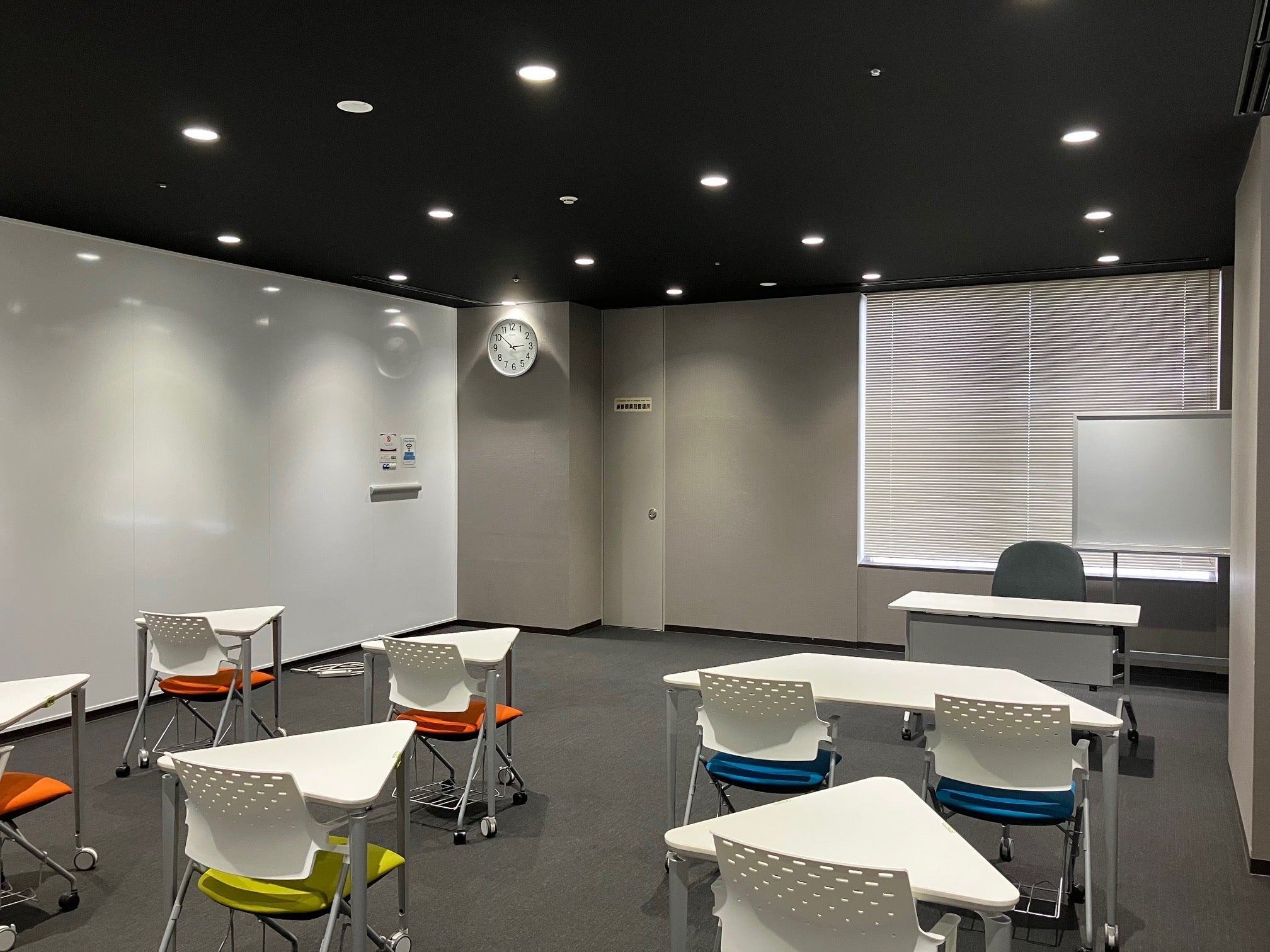 ※7号室は、三角形・台形テーブルの島型レイアウトのお部屋となります。 ※西側の壁全面をホワイトボードとしてご利用頂けます。更に、移動ホワイトボード5台を備え付けております。 ※有線・無線共にインターネットがご使用いただけます。 通信速度に関しては、回線の混雑状況により繋がらない事や速度低下が発生することがあります。