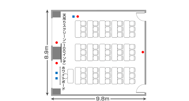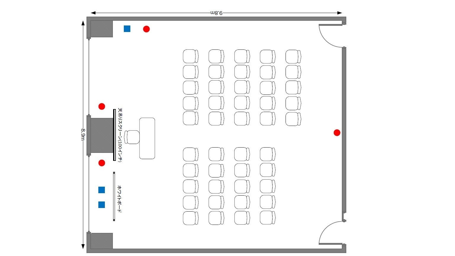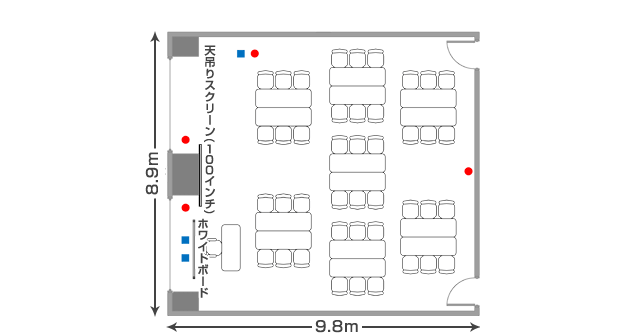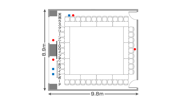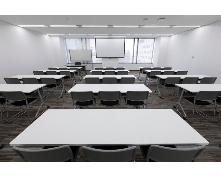 ※天吊りスクリーン100型、ホワイトボード1台が備え付けとなっております。 ※レイアウトは、ご希望に合わせて各種ご用意いたします。 ※有線・無線共にインターネットがご使用いただけます。 通信速度に関しては、回線の混雑状況により繋がらない事や速度低下が発生することがあります。