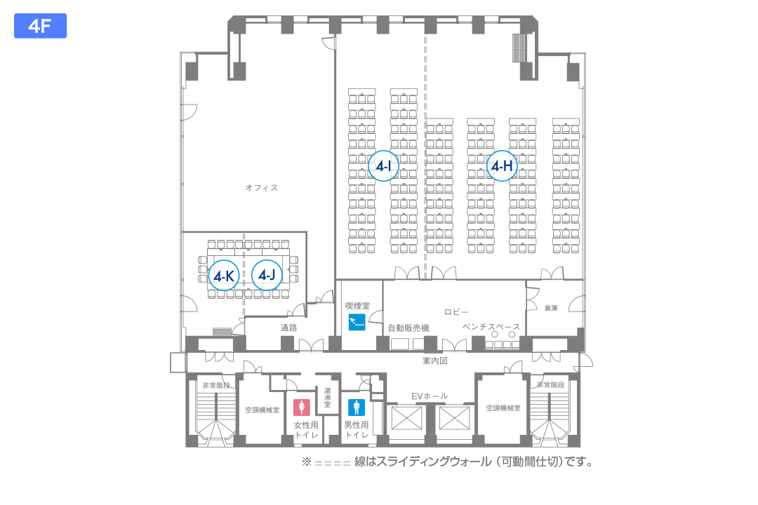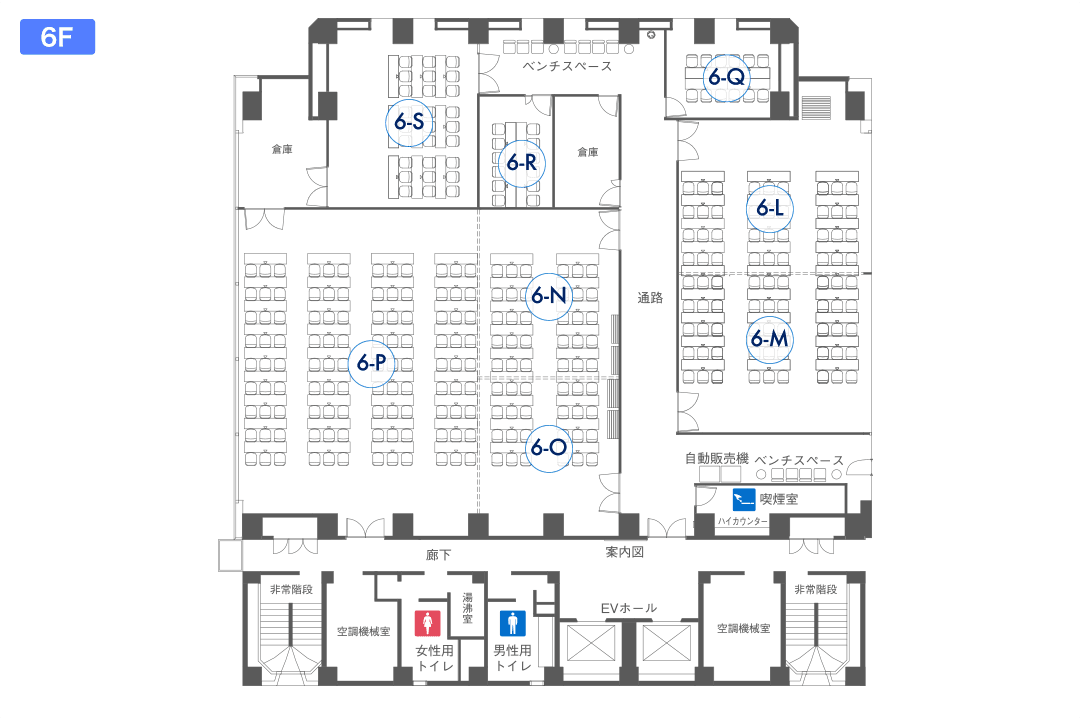 | キャンセルについて | 1.同一階全ルーム又は、6階N+O+Pと5階B+Cと4階H+Iを同時にご利用の場合 ご利用日の起算3ヵ月超、6ヵ月以内:ご利用室料の20% ご利用日の起算1週間超、3ヵ月以内:ご利用室料の50% ご利用日の起算1週間以内 :ご利用室料の100% 2.上記以外のご利用の場合 ご利用日の起算1ヵ月超、2ヵ月以内:ご利用室料の30% ご利用日の起算1週間超、1ヵ月以内:ご利用室料の50% ご利用日の起算1週間以内 :ご利用室料の100% |
