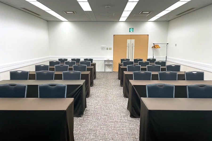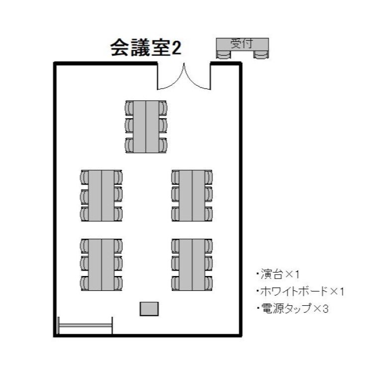 備品】机:10本、椅子30脚※3名掛けの場合/演台:1個 ホワイトボード:1台/壁掛け時計:1個/室外受付:可(希望制)