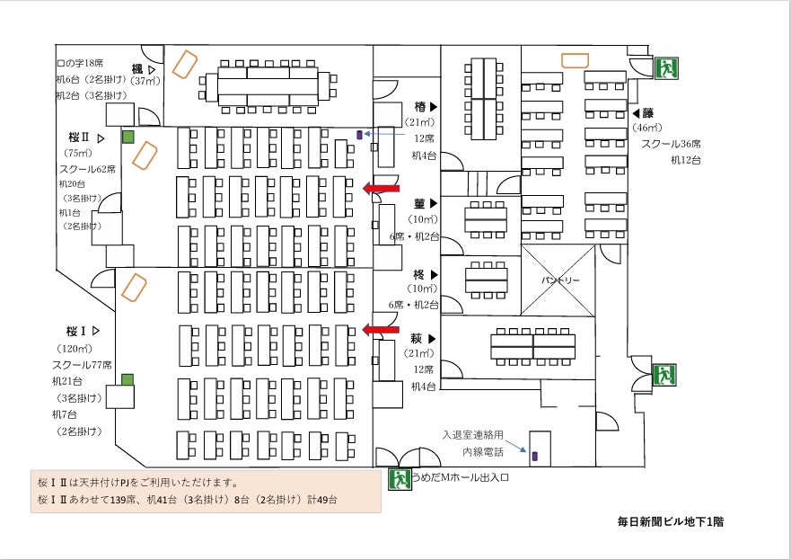 天井高2.7m、基本スクール77名(レイアウト変更可能)。 隣接する桜Ⅱ会議室と合わせて桜Ⅰ+Ⅱ(スクール139席)としても使用可能です。 お電話、メールにてお気軽にお問い合わせください。