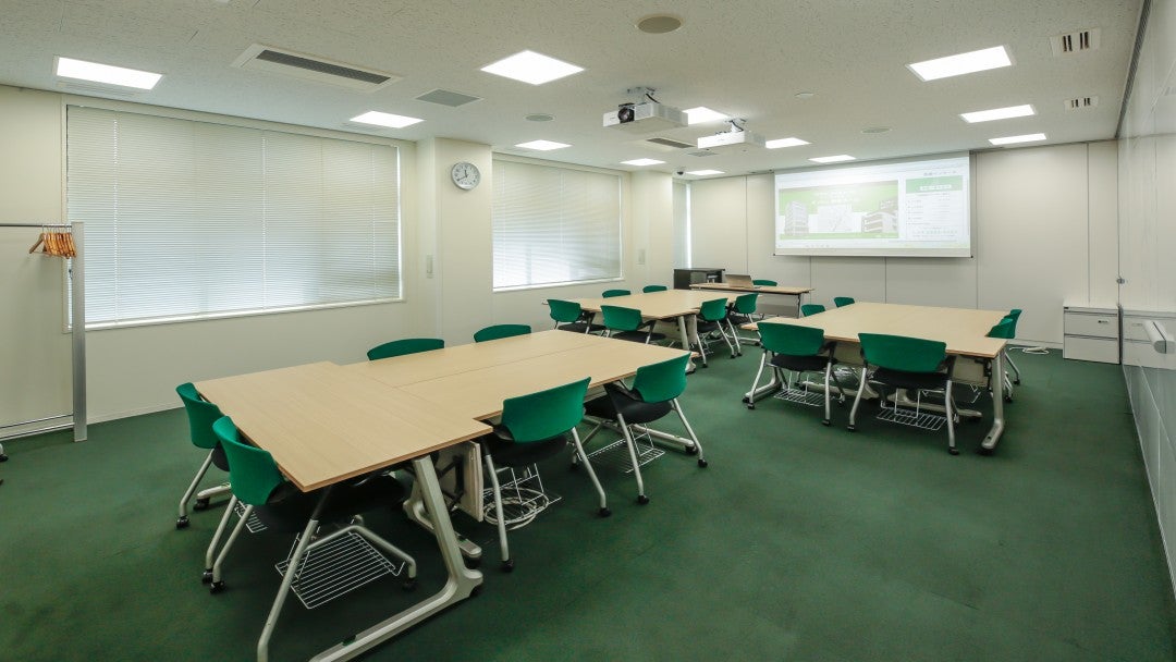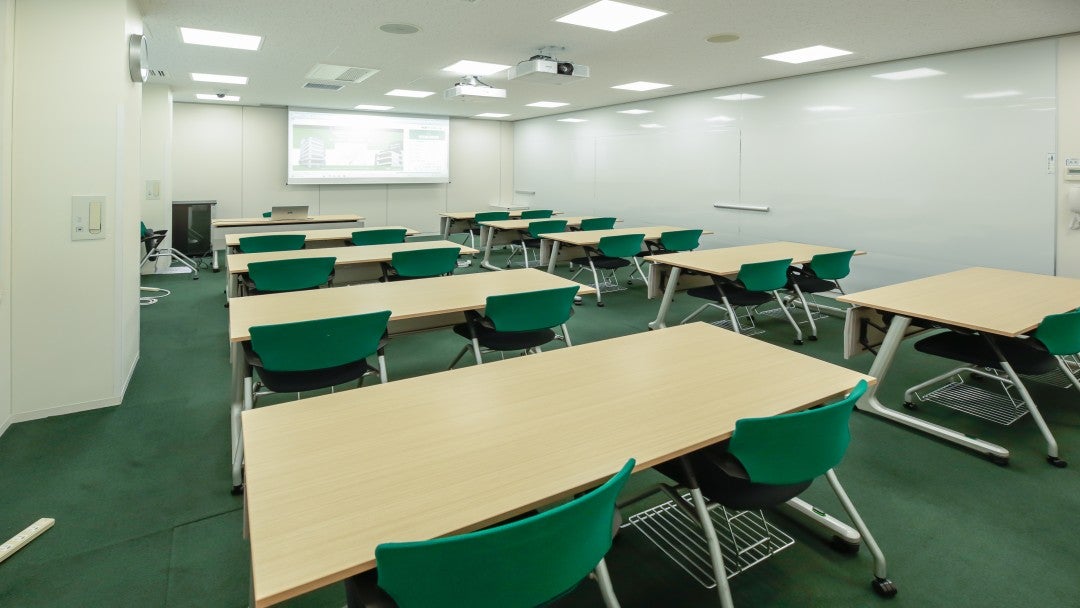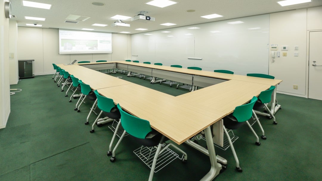 室内の前後に計2台のプロジェクターを備えているので、様々な投影が可能です。 画面を切替える際は、誰でも出来る簡単な操作のみ。 天井から足元までのホワイトボードウォールだから、テープ・磁石で資料を自由に貼ることも出来ます。 多様な設備でプレゼンテーションに最適の部屋となっております。