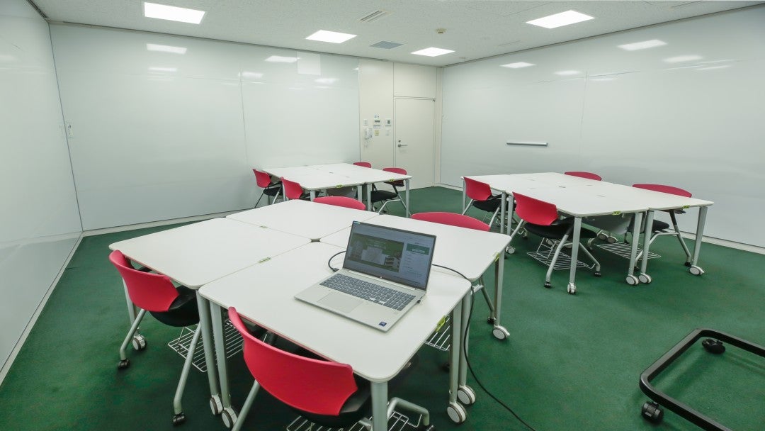 1人用の机が特徴の小会議室。ゆったりと座れて会議に参加できます。 天井から足元までのホワイトボードウォールや貼付・剥離しやすい壁を利用すれば、 いつもの会議がより創造的なものに。