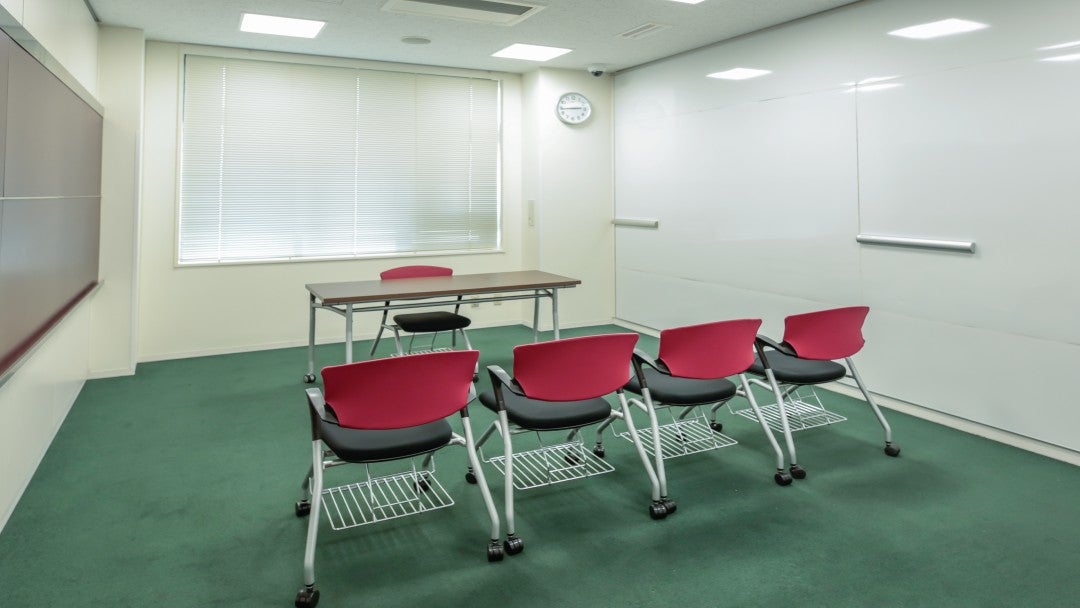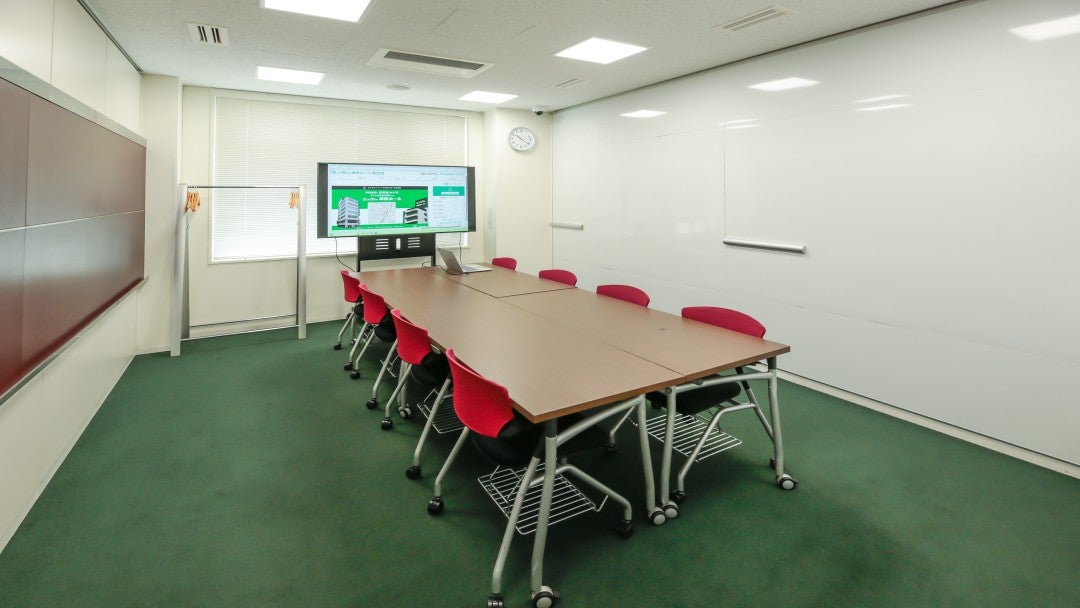 レイアウト【基本島型8名】 天井から足元までのホワイトボードウォールと貼付・剥離しやすい壁など、 便利な機能が満載の小会議室です。 イスには収納棚付きなので、手荷物の置場にも困りません。