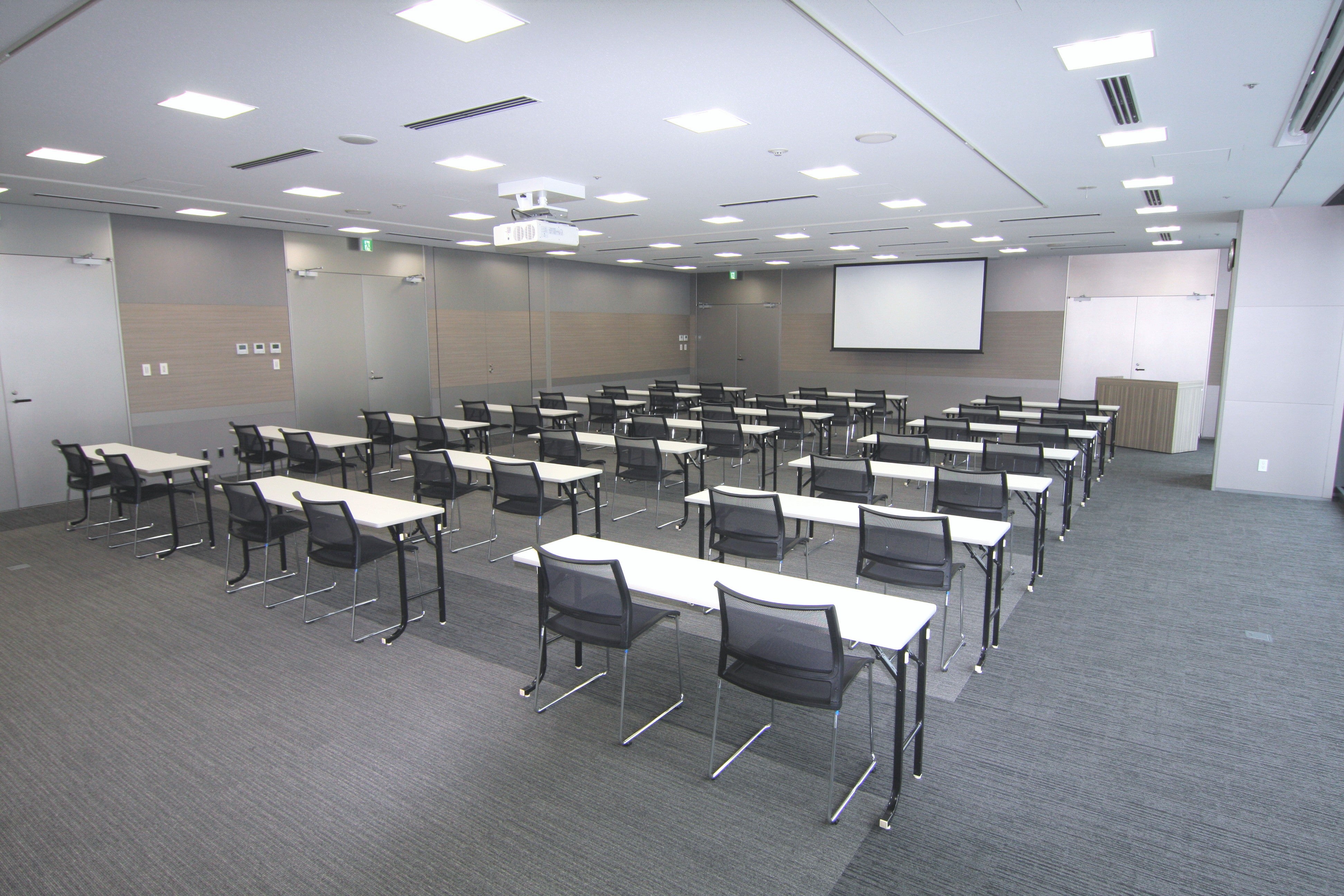 B・C2つのスペースを連結した、明るく開放的な空間。100~160名規模のセミナーや会議、展示会に最適。備え付けのプロジェクターやスクリーンを活用したプレゼンテーションも可能です。 ★天吊プロジェクター、スクリーン、音響セット(マイク2本込)、ホワイトボードが室料込み備品です。