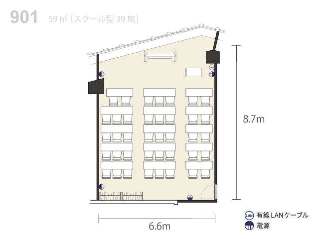 Free Wi-Fiあり! 程よい定員数の為、何をするにも適しているお部屋です。 レイアウト変更によってさらに使用目的の幅が広がります。