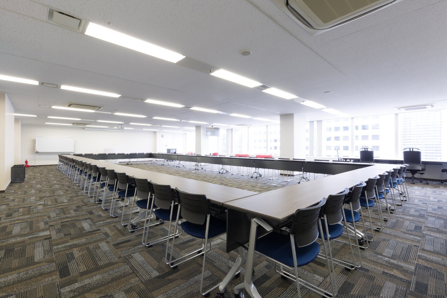 ※他会議室と音響設備が異なります。詳細はお問い合わせくださいませ。 1机2名掛けの場合 スクール:84人 ロの字:40人 コの字:34人 島型:60人(15島)
