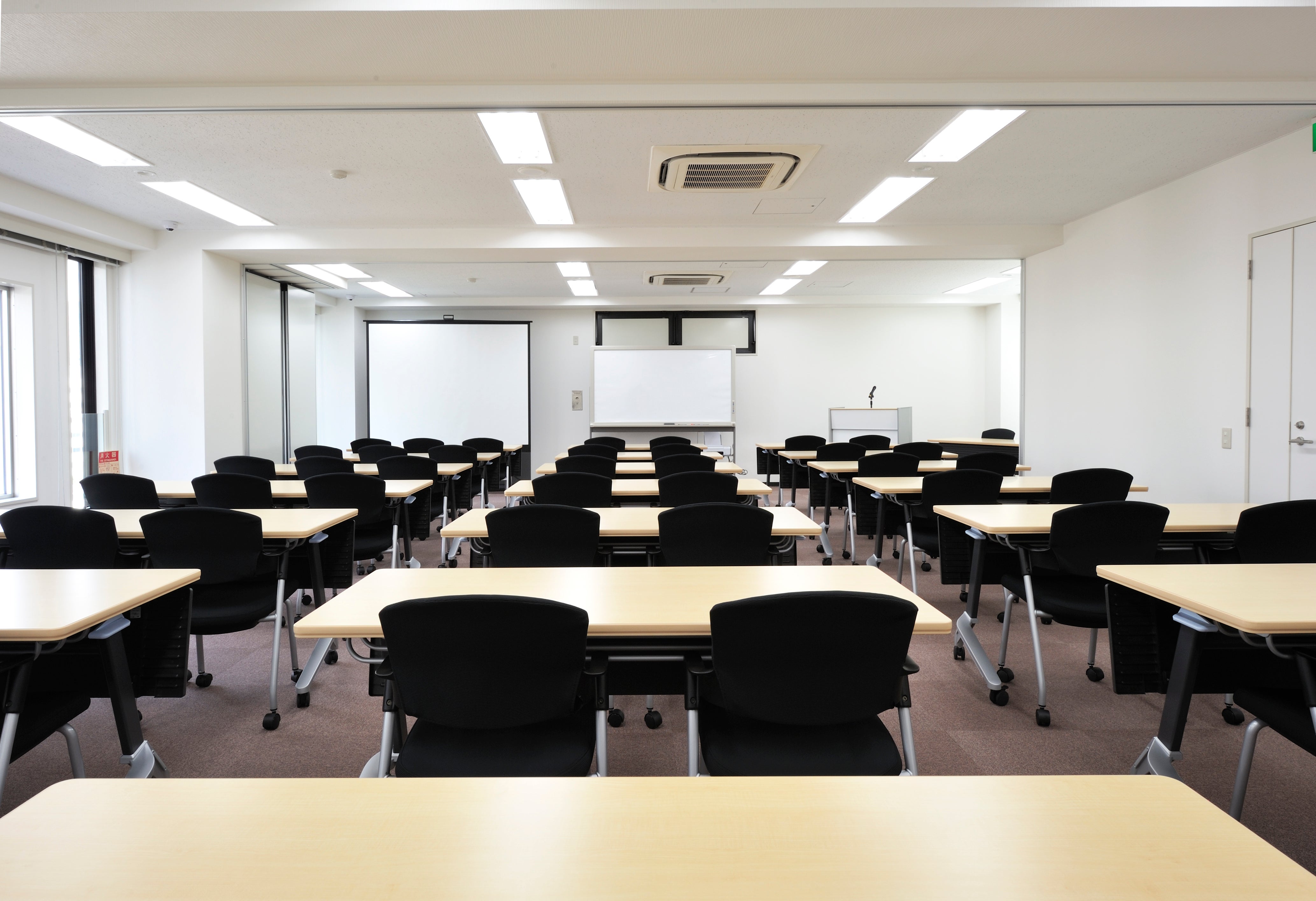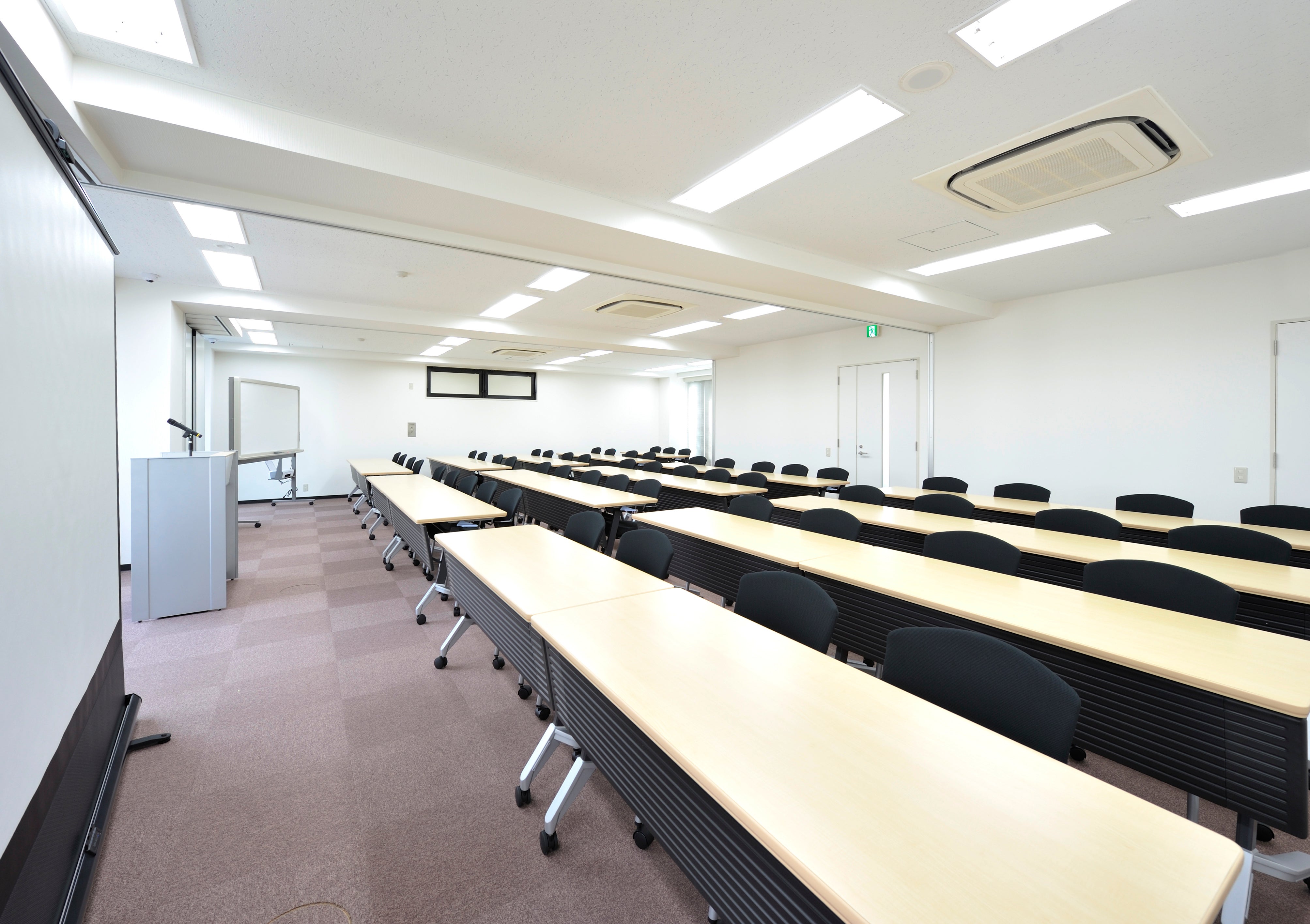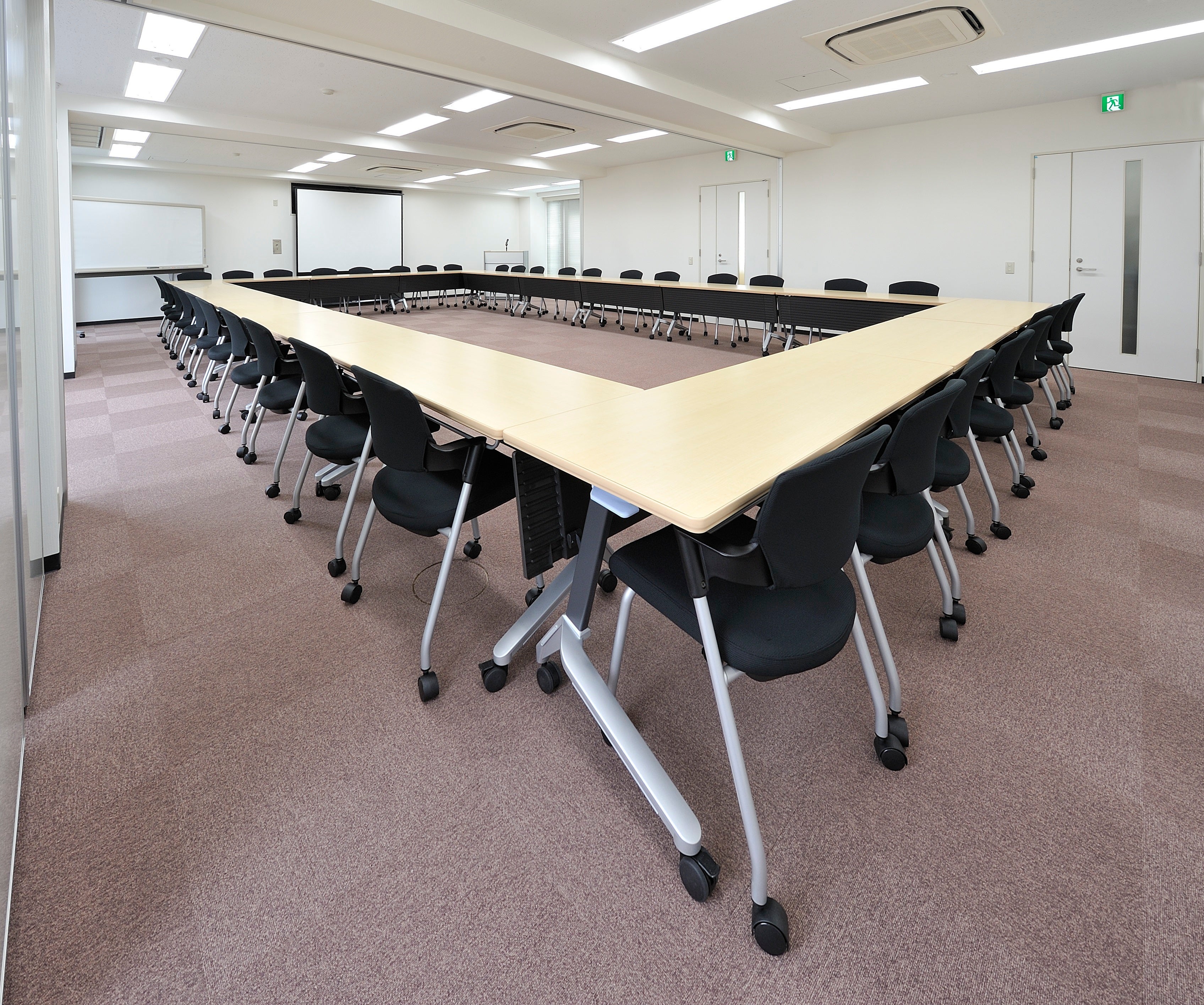 スクール形式55名様、ロの字形式38名様の、まる八ではもっとも広い会議室。 (最大時スクール62名様収容可能です。) 会議はもちろん、各種セミナーや講演会等にお使いいただけます。 ロの字型やスクール形式だけでなく、ご利用用途に合ったレイアウトでセッティングいたします。ご相談ください。
