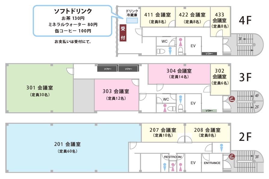 | 受付対応時間 | 貸会議室の利用時間は08:00-22:00(スタッフ在駐時間は09:30~17:30) |