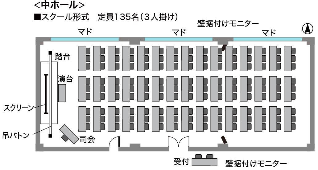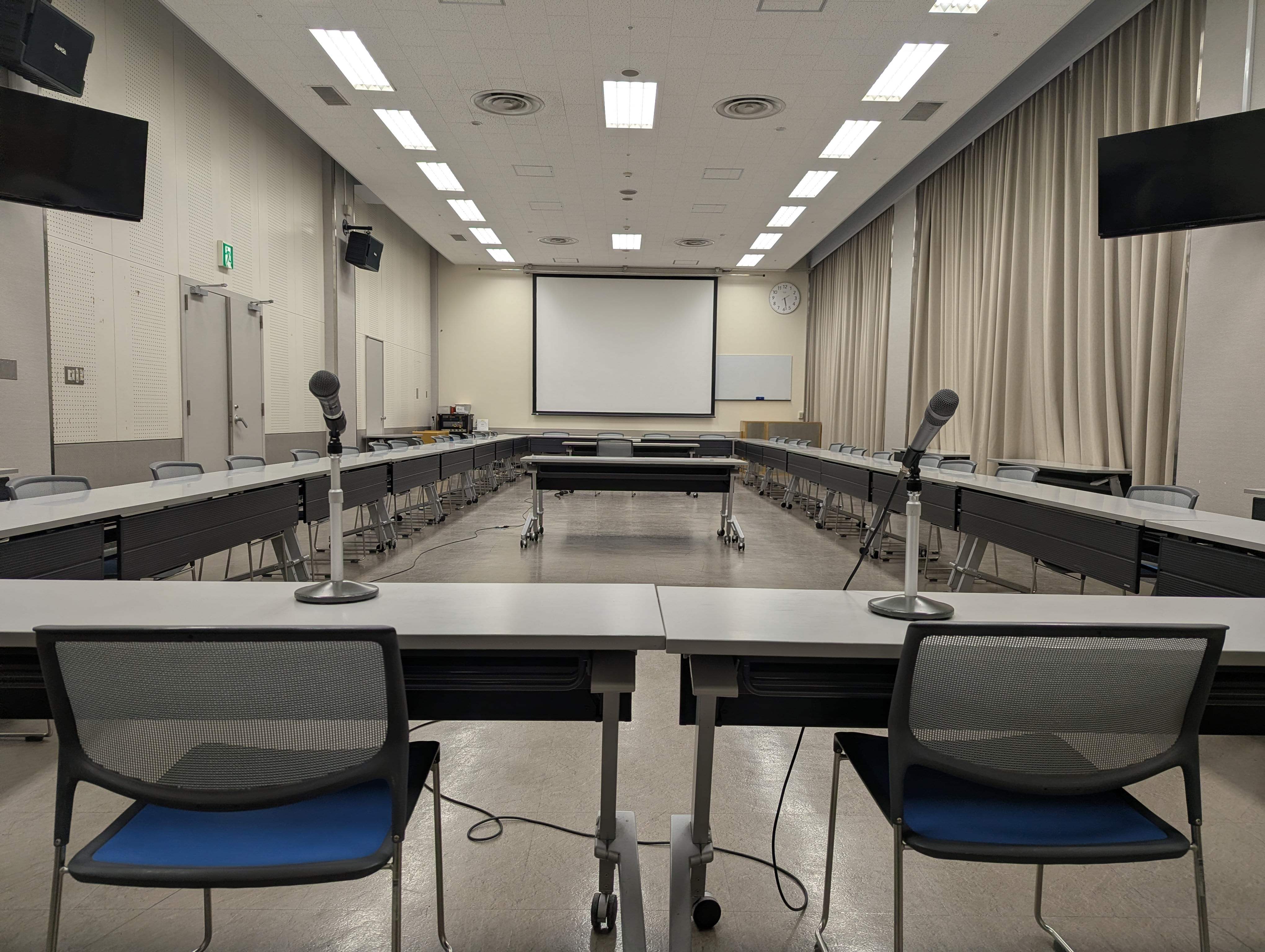 8階中ホールと隣接の小ホールの間仕切りシャーターを開放すると、中・小ホール通しでご利用が可能。最大収容人数216席確保。また、多目的ホールとなっており、展示会やポスターセッション等のイベント開催も可能。