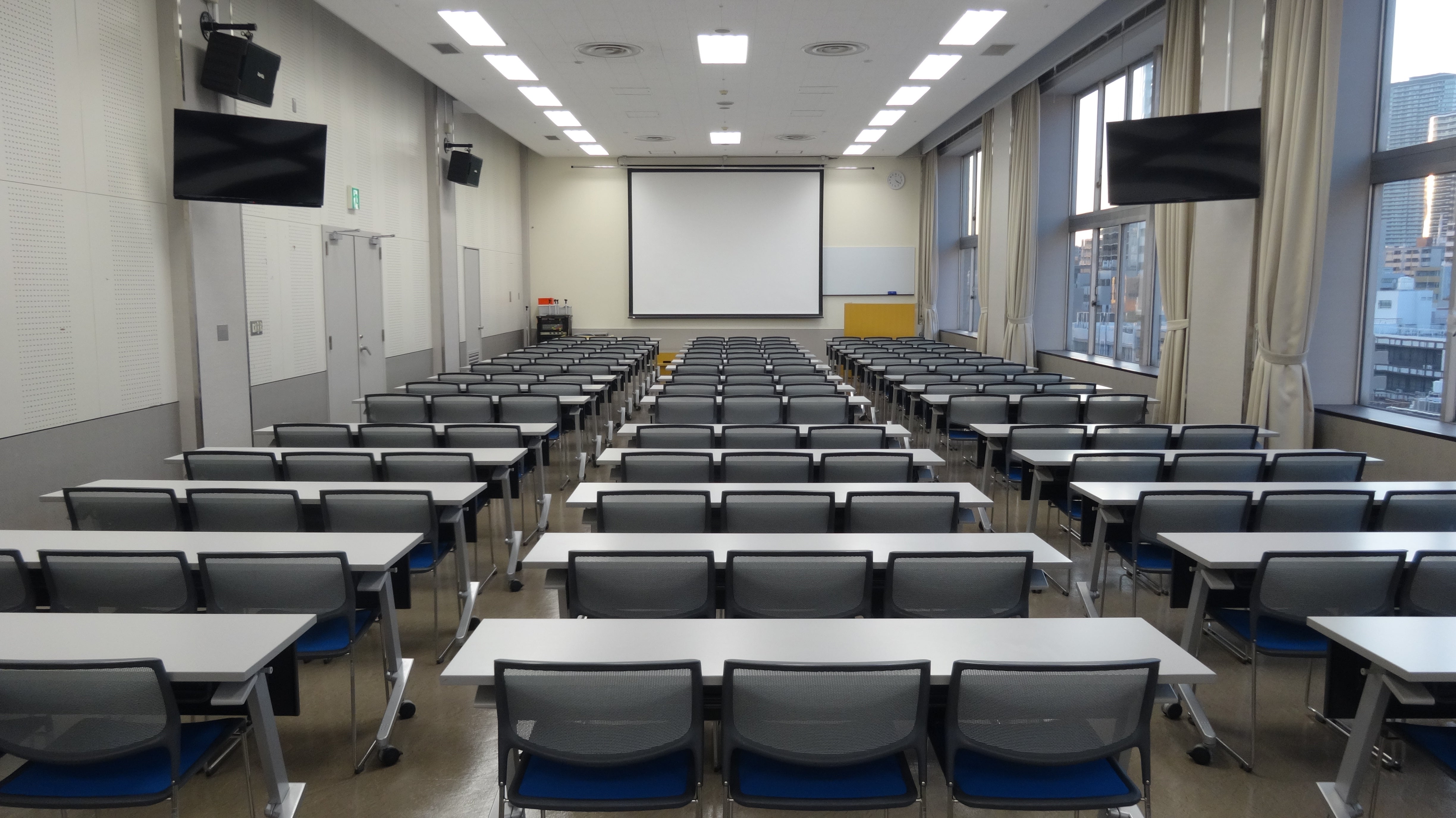 8階中ホールと隣接の小ホールの間仕切りシャーターを開放すると、中・小ホール通しでご利用が可能。最大収容人数216席確保。また、多目的ホールとなっており、展示会やポスターセッション等のイベント開催も可能。
