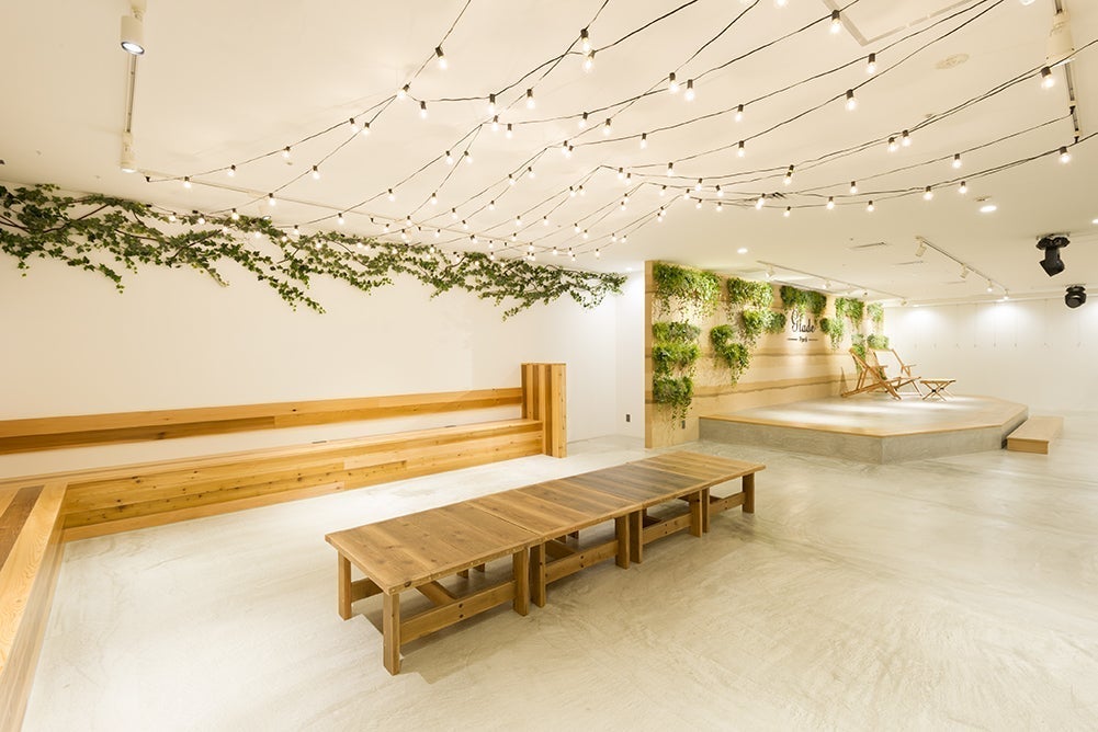 ◆営業時間9:00~22:00 ◆広さ約273㎡(着席:60名 立食:150名) ◆使い放題設備 備品 クローク 客席テーブル 14台 客席椅子 50脚 折畳椅子 20脚 高砂椅子 2脚 ミキサー ホワイトボード パーテーション 無料WiFi