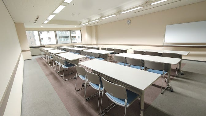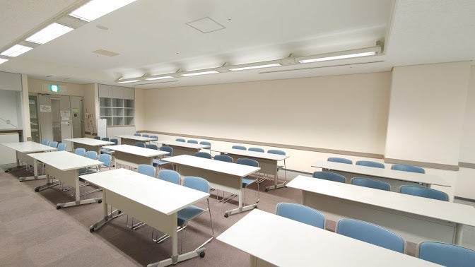 ●通常スクール形式で36名収容 ●ロの字やコの字など、レイアウト変更も自由です(利用時間内で準備・原状復帰を行って下さい) ●無料常設備品:ホワイトボード(1枚)、スクリーン(1枚)、可動式台(1台)、案内板(1台)、傘立て(1台)、作り付け棚、クローク ●お部屋の鍵、ホワイトボード用マーカーは2階受付でお渡し致します ●館内ゴミ箱ございません。お客様でお持ち帰りをお願い致します。