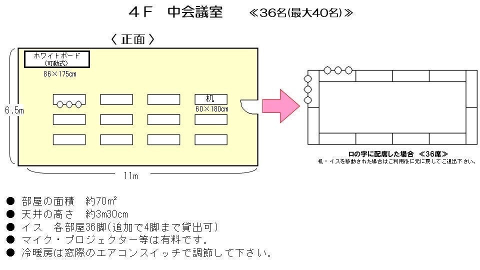 おすすめ用途 | 会議、セミナー、講演会、研修、会社説明会、勉強会、面接会場、試験会場、展示会 |