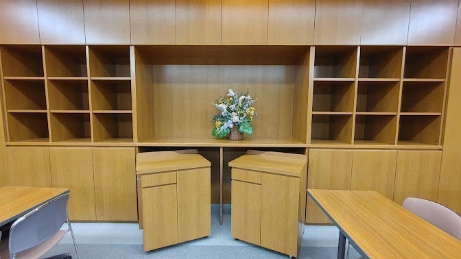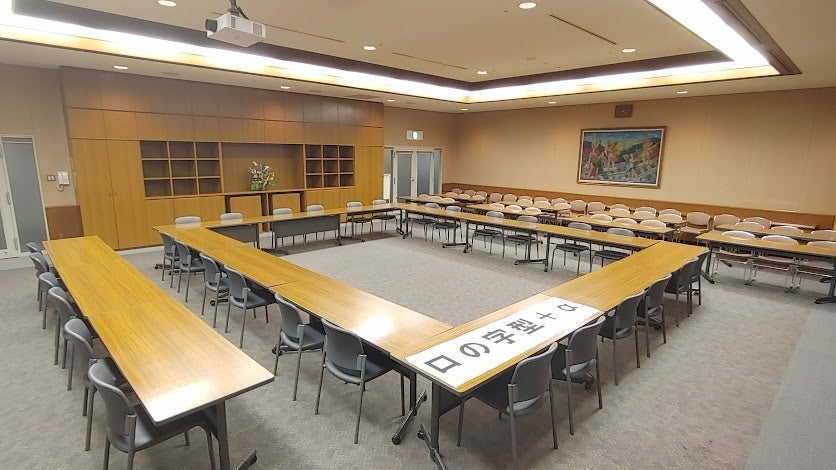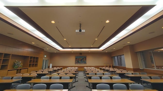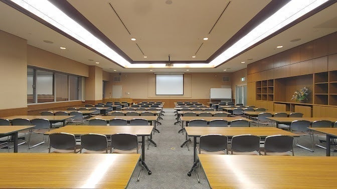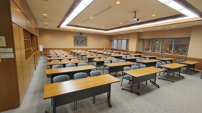 ●通常スクール形式で96名収容 ●レイアウト変更も自由です(利用時間内で準備・原状復帰を行って下さい)。 ●無料常設備品:ホワイトボード(2枚)、案内板(1台)、スクリーン(1枚)、可動式台(2台)、傘立て(1台)、Wi-Fi、有線LAN ●お部屋の鍵、ホワイトボード用マーカーは2階受付でお渡し致します。 ●館内ゴミ箱ございません。お客様でお持ち帰りをお願い致します。
