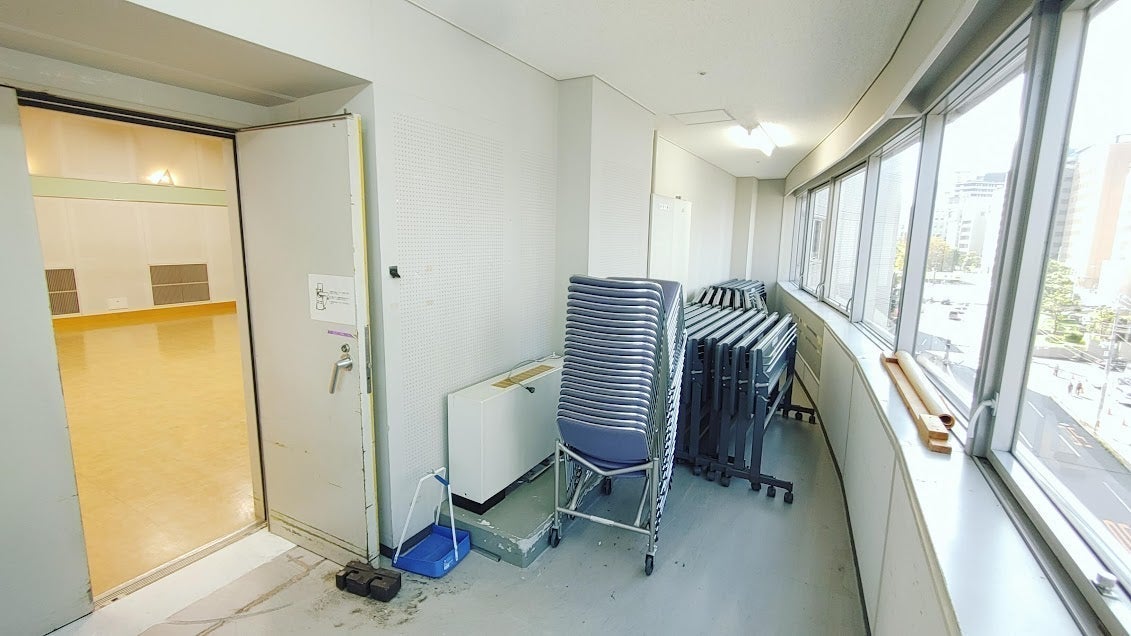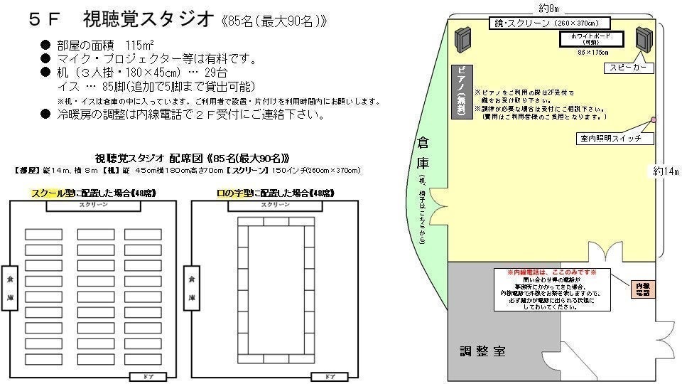 ●通常スクール形式で85名収容 ●レイアウトは自由です(利用時間内で準備・原状復帰を行って下さい)。 ●無料常設備品:ホワイトボード(1枚)、鏡、案内板(1台)、スクリーン(1枚)、アップライトピアノ(1台)、ハンガーラック(1台)、Wi-Fi、有線LAN ●お部屋の鍵、ホワイトボード用マーカーは2階受付でお渡し致します。 ●館内ゴミ箱ございません。お客様でお持ち帰りをお願い致します。