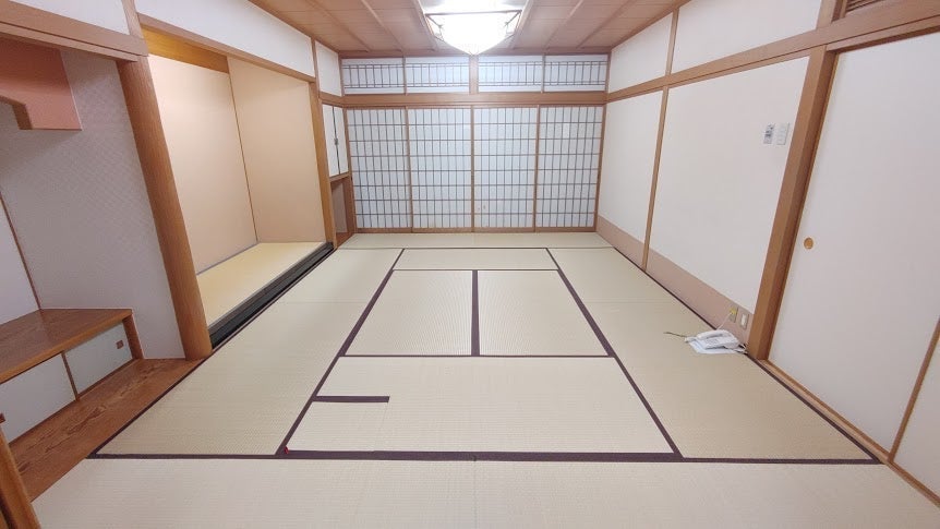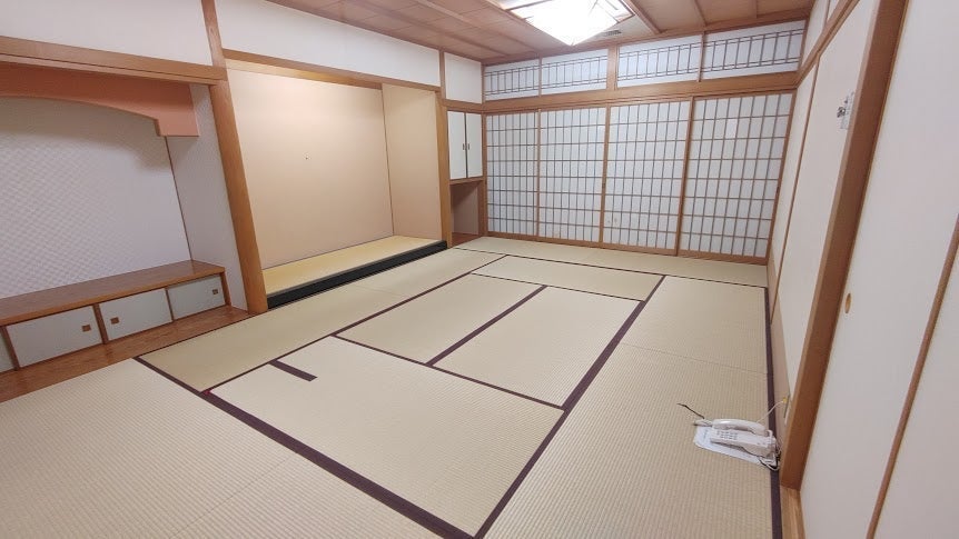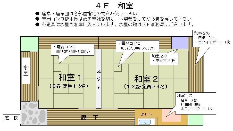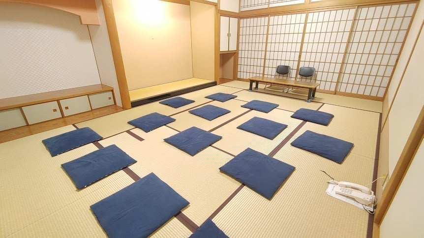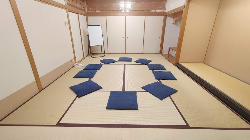 ●12畳24名収容 ●レイアウトも自由です(利用時間内で準備・原状復帰を行って下さい)。 ●無料常設備品:座布団(24枚)、座卓(10台)、ホワイトボード(1枚)、案内板(1台)、傘立て(1台)、姿見1枚、Wi-Fi ●お部屋の鍵、ホワイトボード用マーカーは2階受付でお渡し致します。 ●館内ゴミ箱ございません。お客様でお持ち帰りをお願い致します。