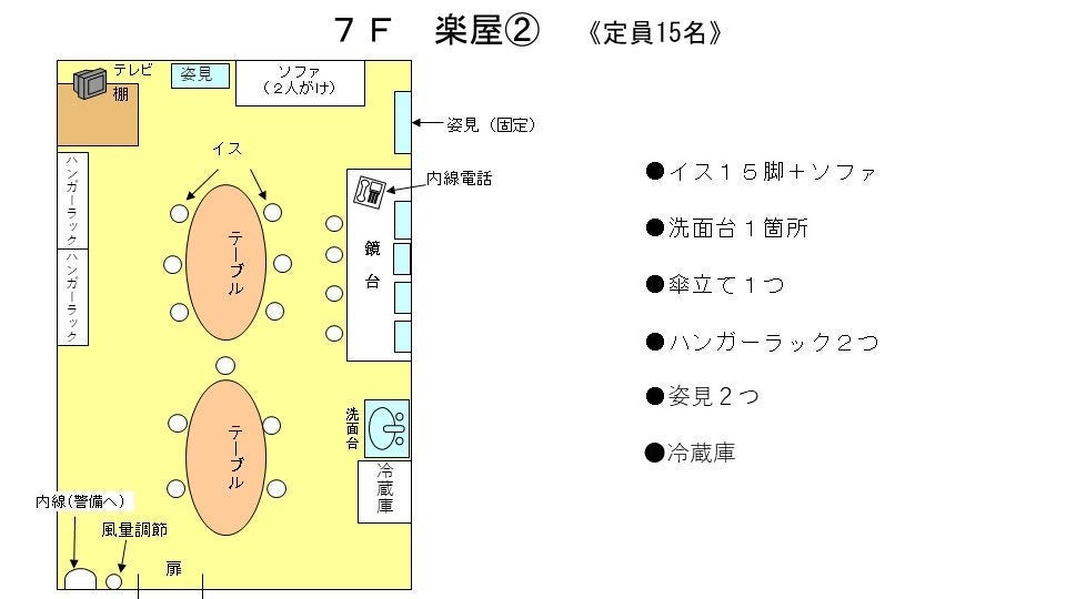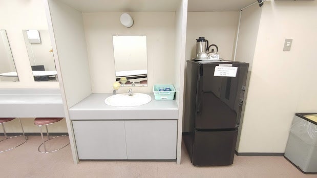 ●定員15名 ●レイアウト変更も自由です(利用時間内で準備・原状復帰を行って下さい)。 ●鏡台4台(各席コンセント付き) ●洗面台1か所 ●4人掛けテーブル2台 ●冷蔵庫1台 ●姿見2枚 ●ゴミはお持ち帰りをお願い致します。 室内モニターでホールの様子もご覧いただけます