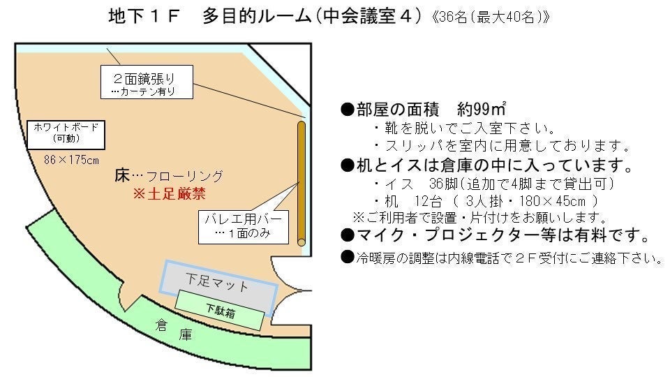 おすすめ用途 | セミナー、研修、ワークショップ、ダンスレッスン、演劇稽古、ヨガ、軽運動、楽器練習等 |