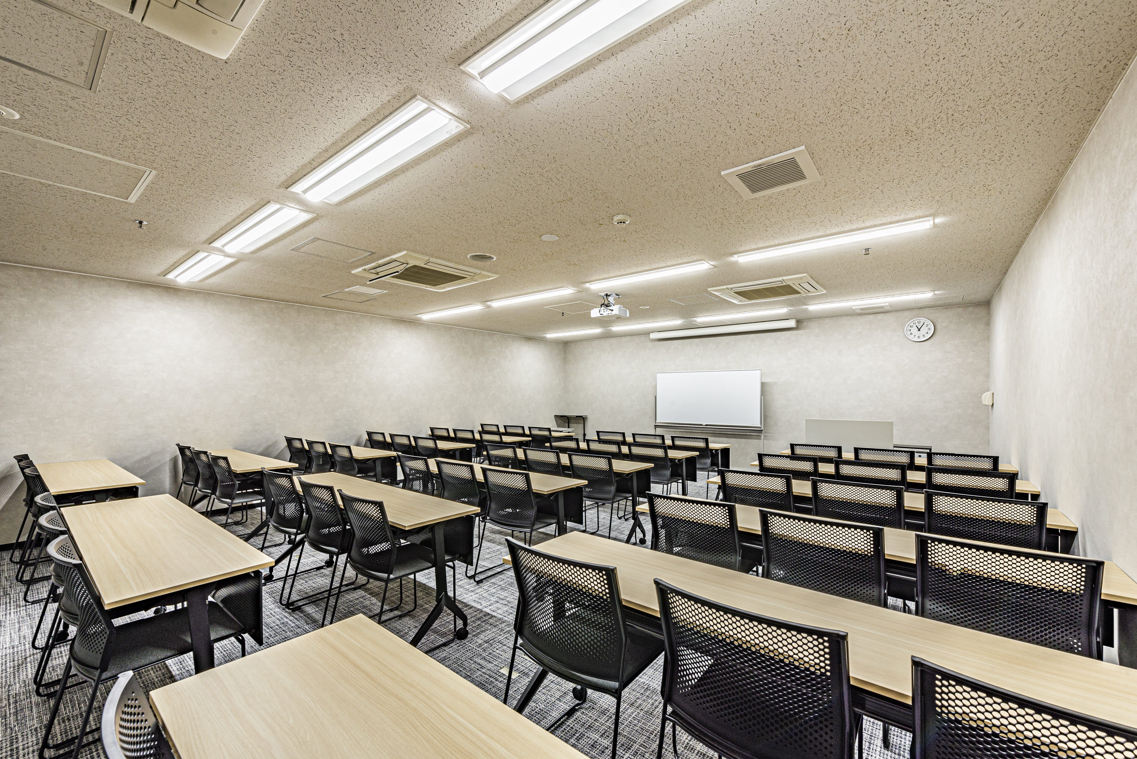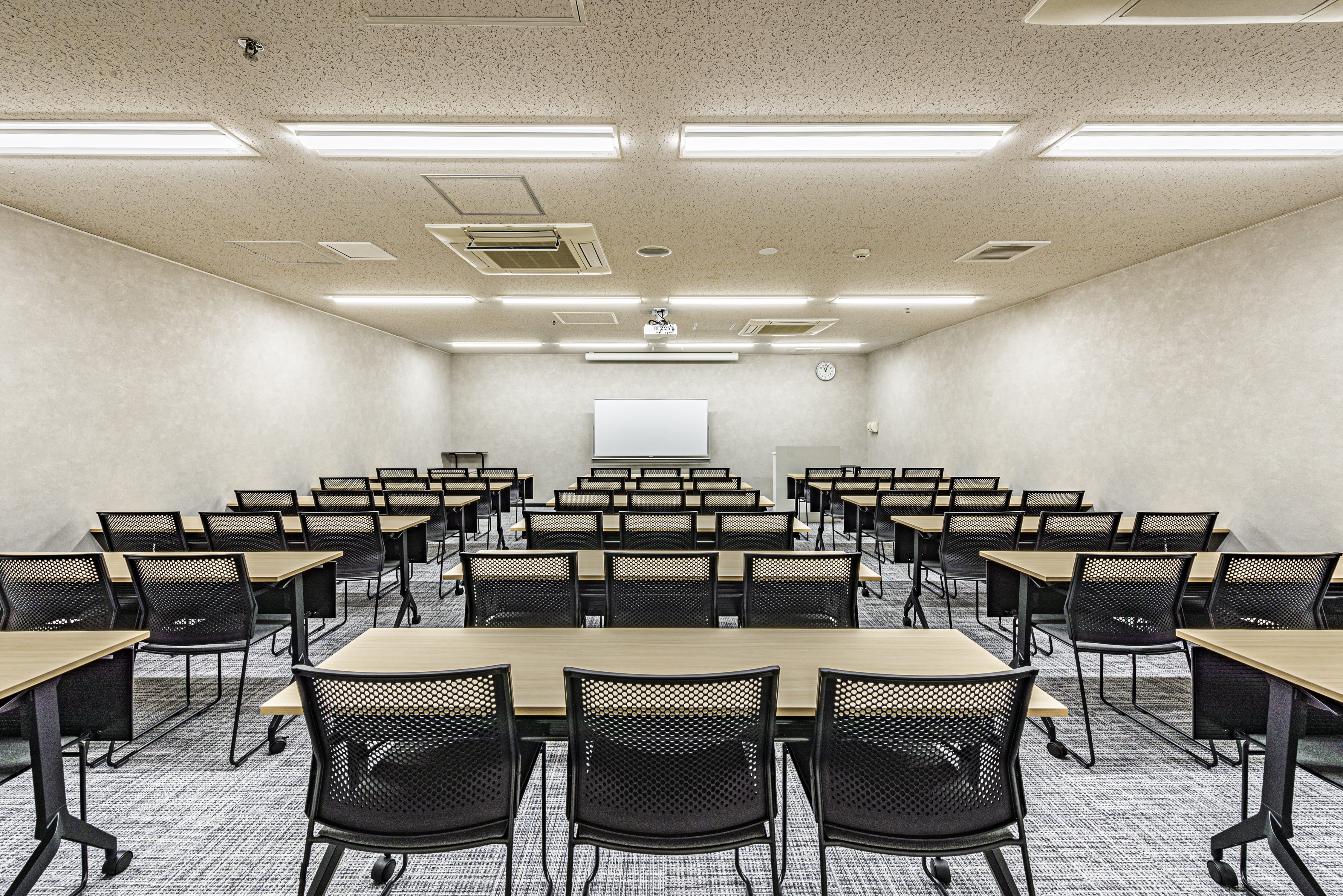 B1Fの会場でございます。スクール形式最大54名収容可能な中規模会場でございます。受付が隣になり、何かございましたらすぐお声がけいただけます。 会議、研修、サテライトオフィスなどにも最適です。