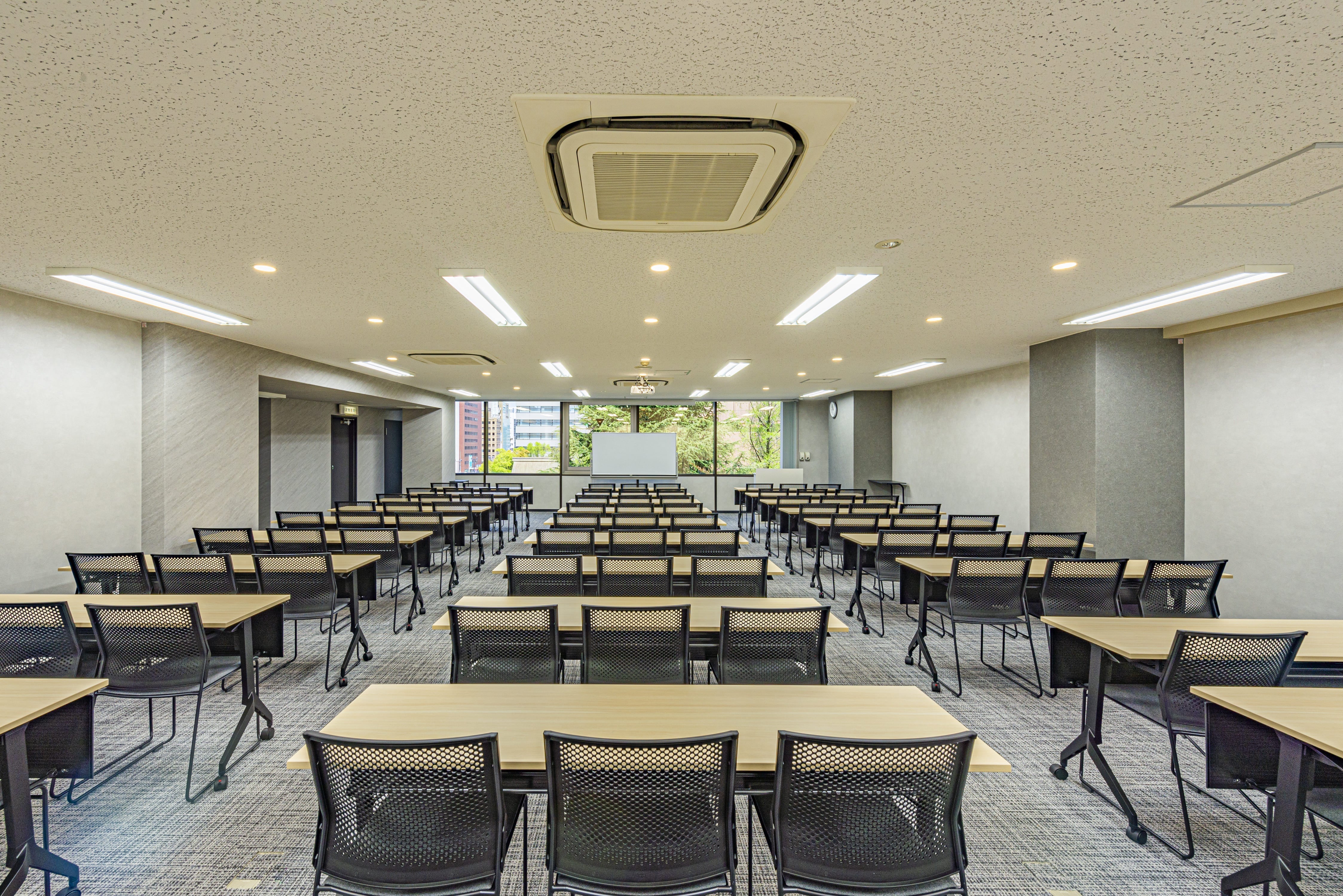 スクール形式最大90名収容の大規模会場でございます。 前方に大きな窓を兼ね備えており、明るく開放的なお部屋となっております。面積もかなり大きいため、ロの字での会議や懇親会などに最適。当会議室人気№1のお部屋です。