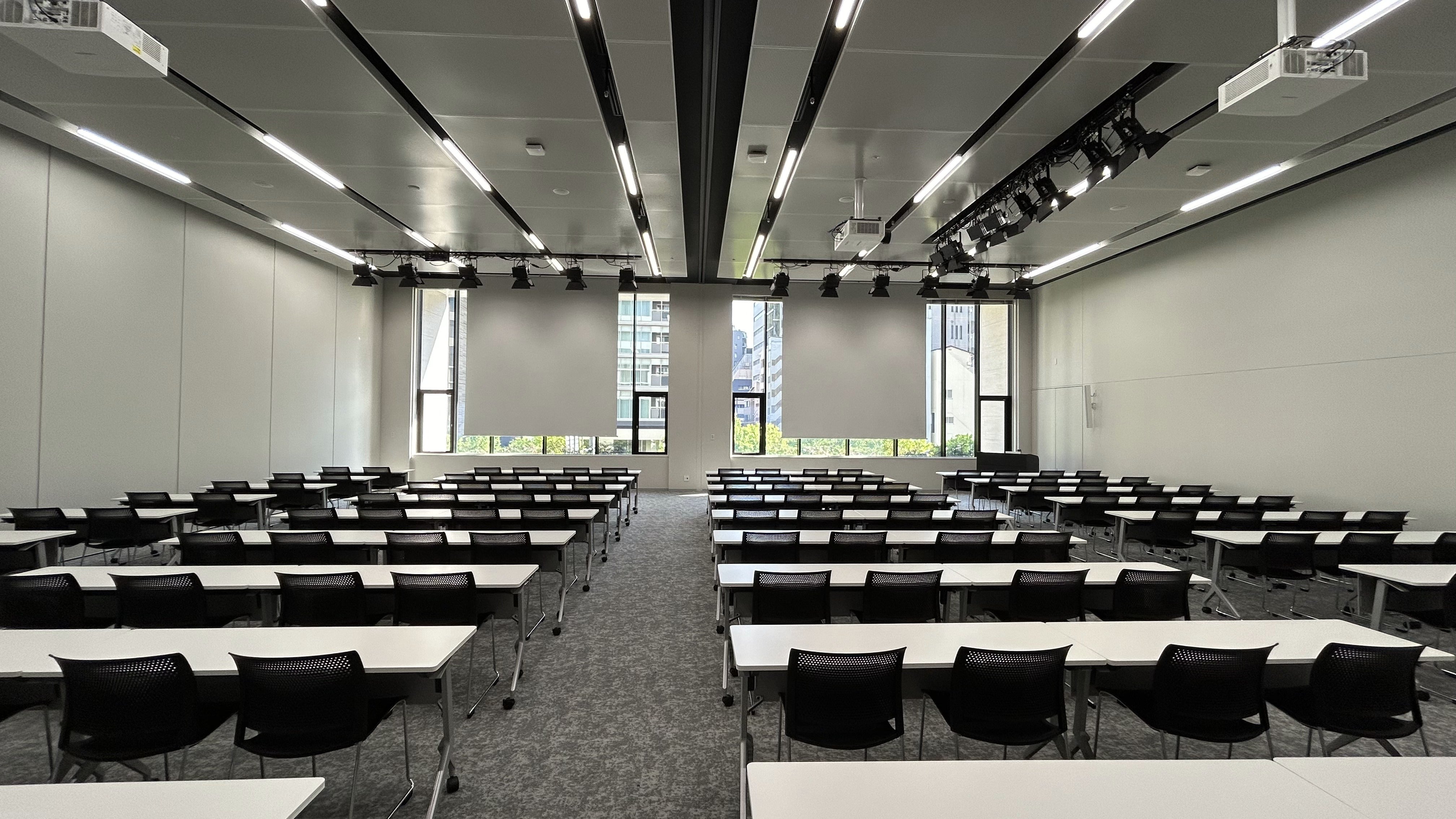 ■天井高4.5mの無柱空間 柱のない整形な空間のため、レイアウトがしやすくセミナーや株主総会、展示会等様々な用途でご利用頂けます。 ■充実の設備備品 電動昇降スクリーン(150~200型)、天吊式プロジェクタをはじめ、操作ワゴンに組み込んだタッチパネルで音響や照明の操作が可能です。各種貸出備品もございます。