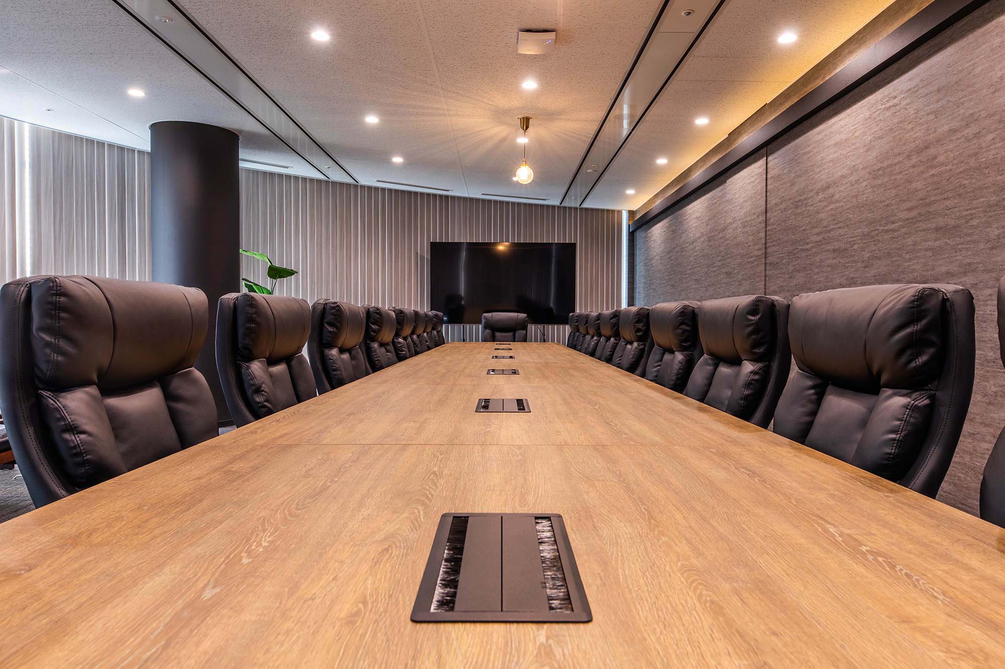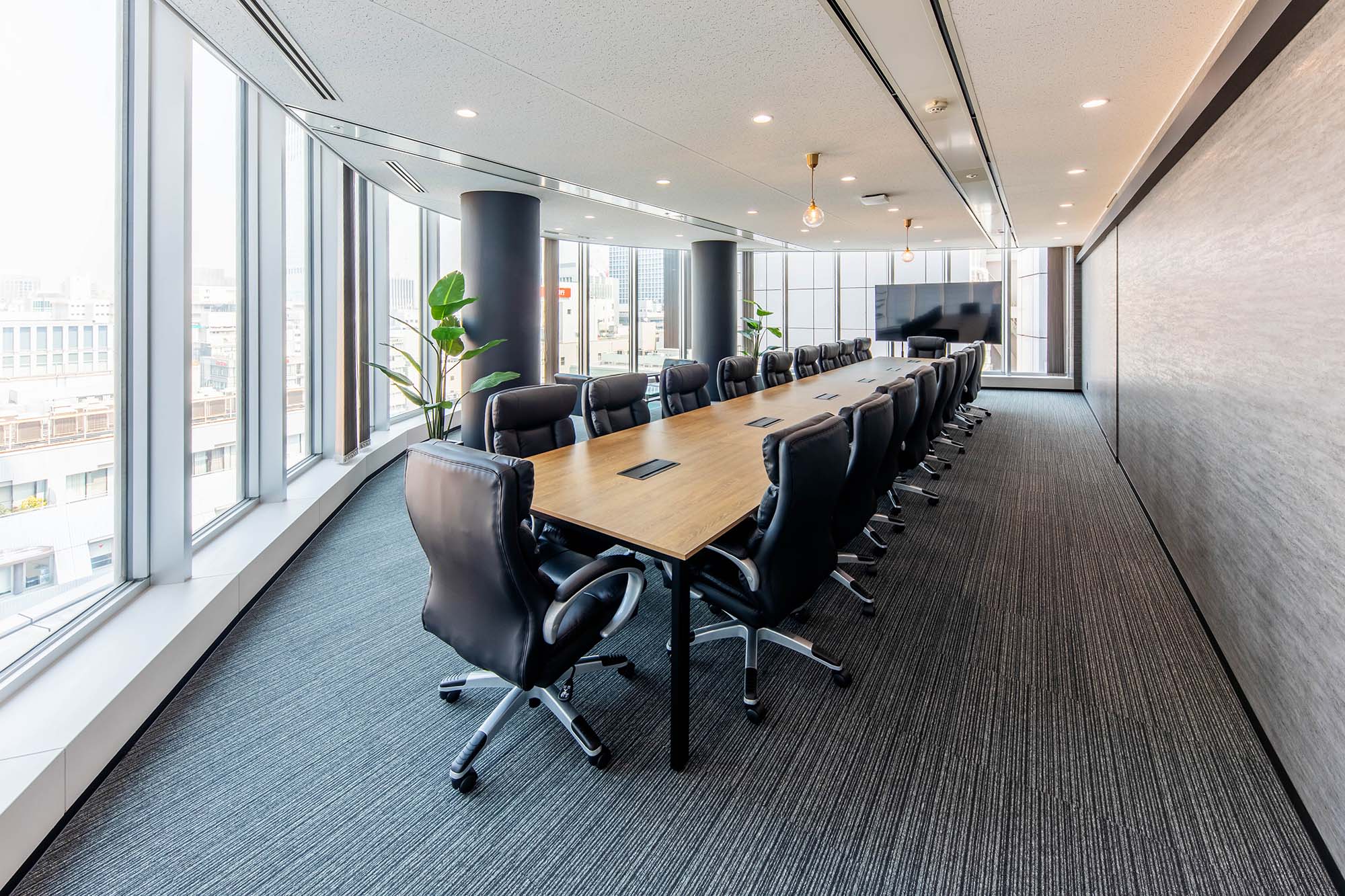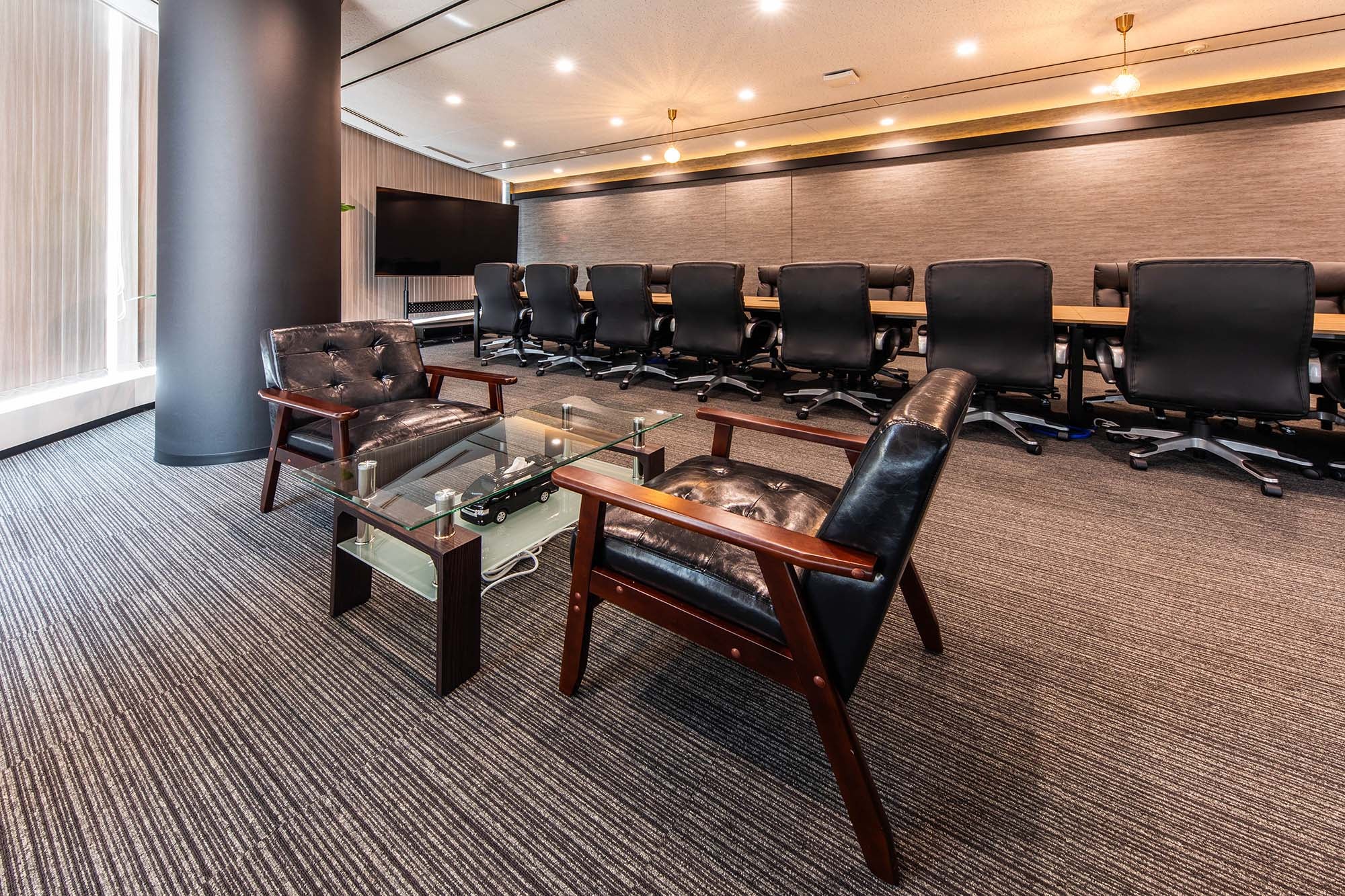 撮影やインタビュー会場としてもおすすめの、高級感漂う特別仕様のエグゼクティブルーム。 7.3mの大テーブルにふかふかの高級チェア、そして85インチの液晶モニター付きで、大切な商談や役員会議、ハイレベルなプレゼンテーションなど特別な場にふさわしい空間をご提供します。応接セットも備えており、打ち合わせや商談前後のウェイティングにも最適。大きな窓から差し込む自然光が心地よい開放感のある空間を演出します。