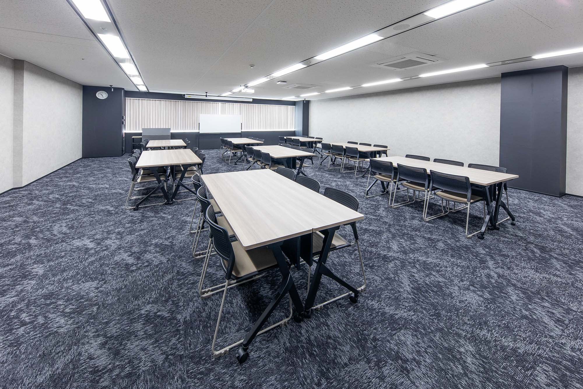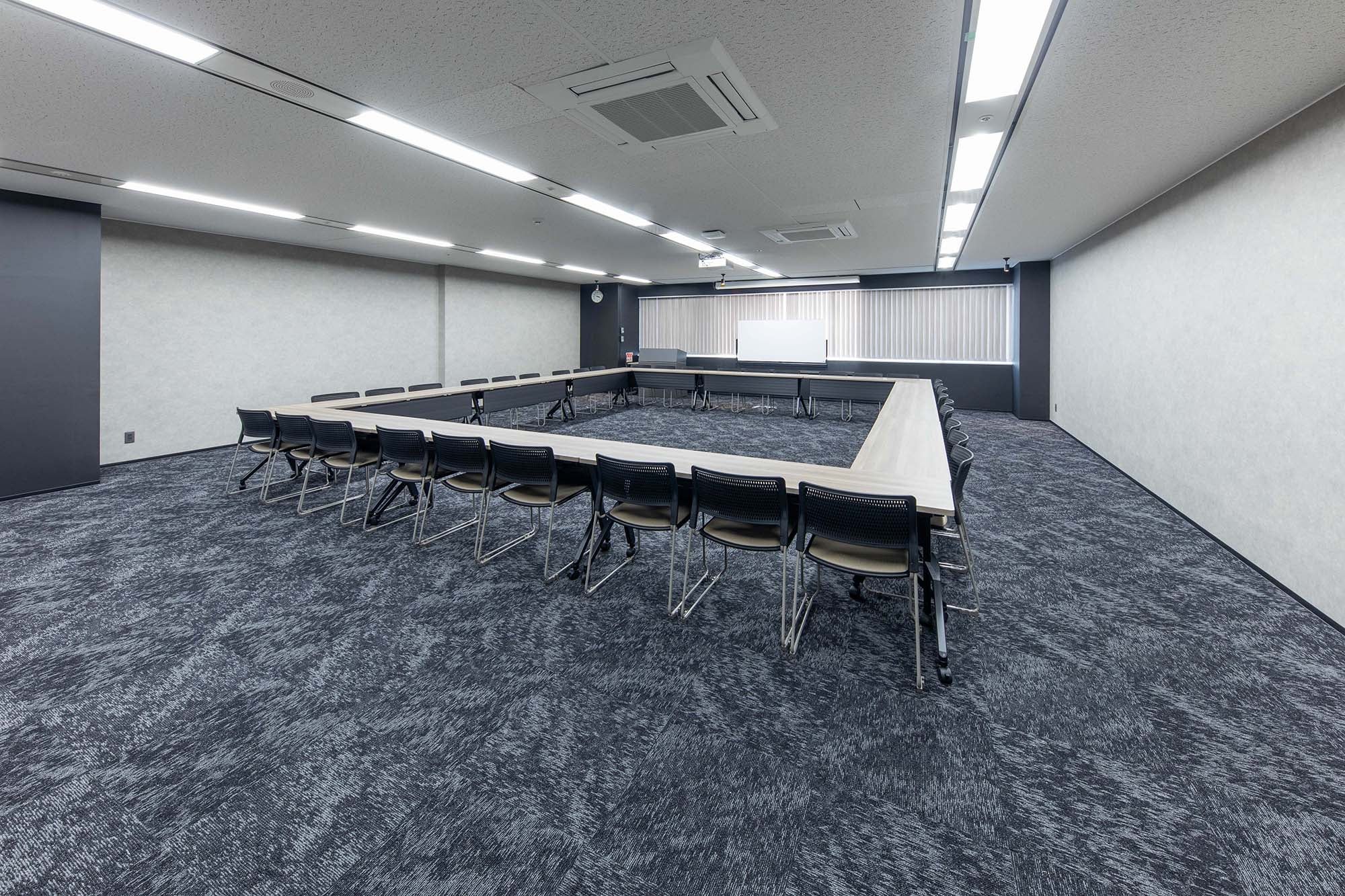 シンプルながら機能性に優れた、定員72名のスタンダードな会議室です。 スクール形式でのセミナーや研修に最適な広さを確保しつつ、ロの字形式では36名がゆったりと着席可能。会議やグループディスカッションにも柔軟に対応します。室内はグレーを基調とした落ち着いた配色で、集中力を高めるシックな空間設計。 120インチの電動スクリーンと5,200ルーメンの高輝度レーザープロジェクターも完備(有料オプション)