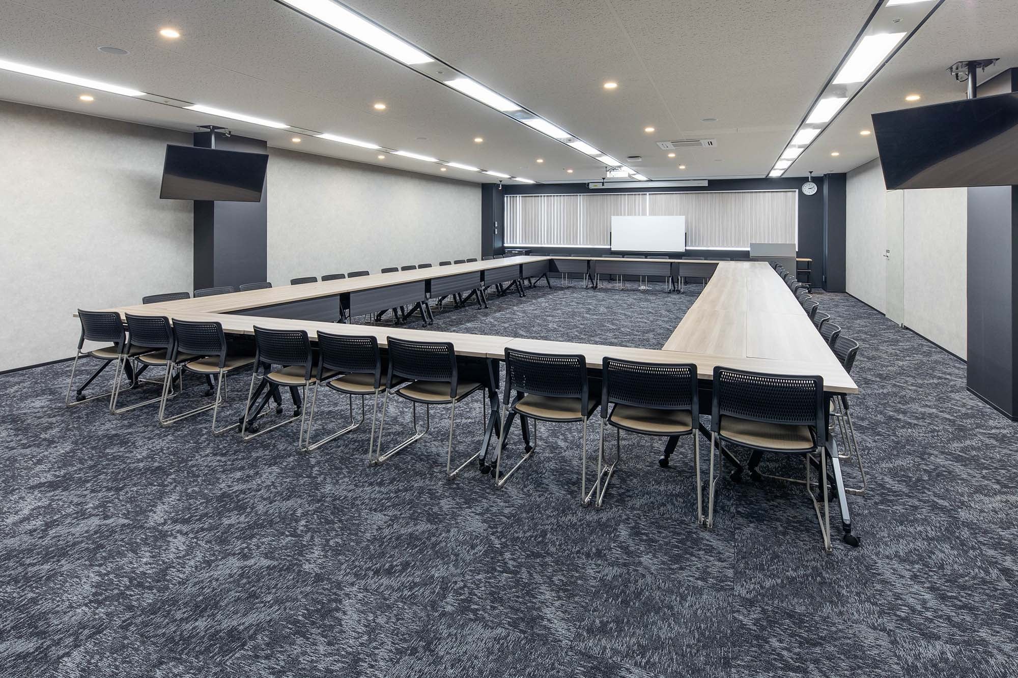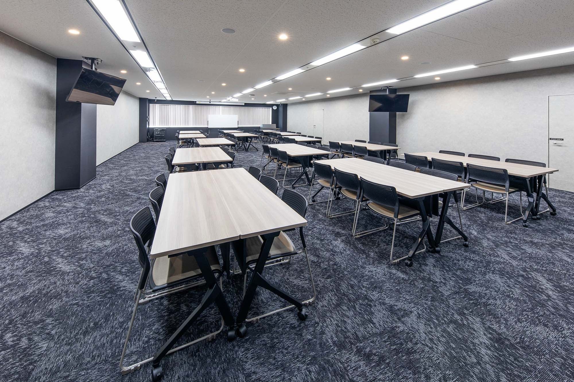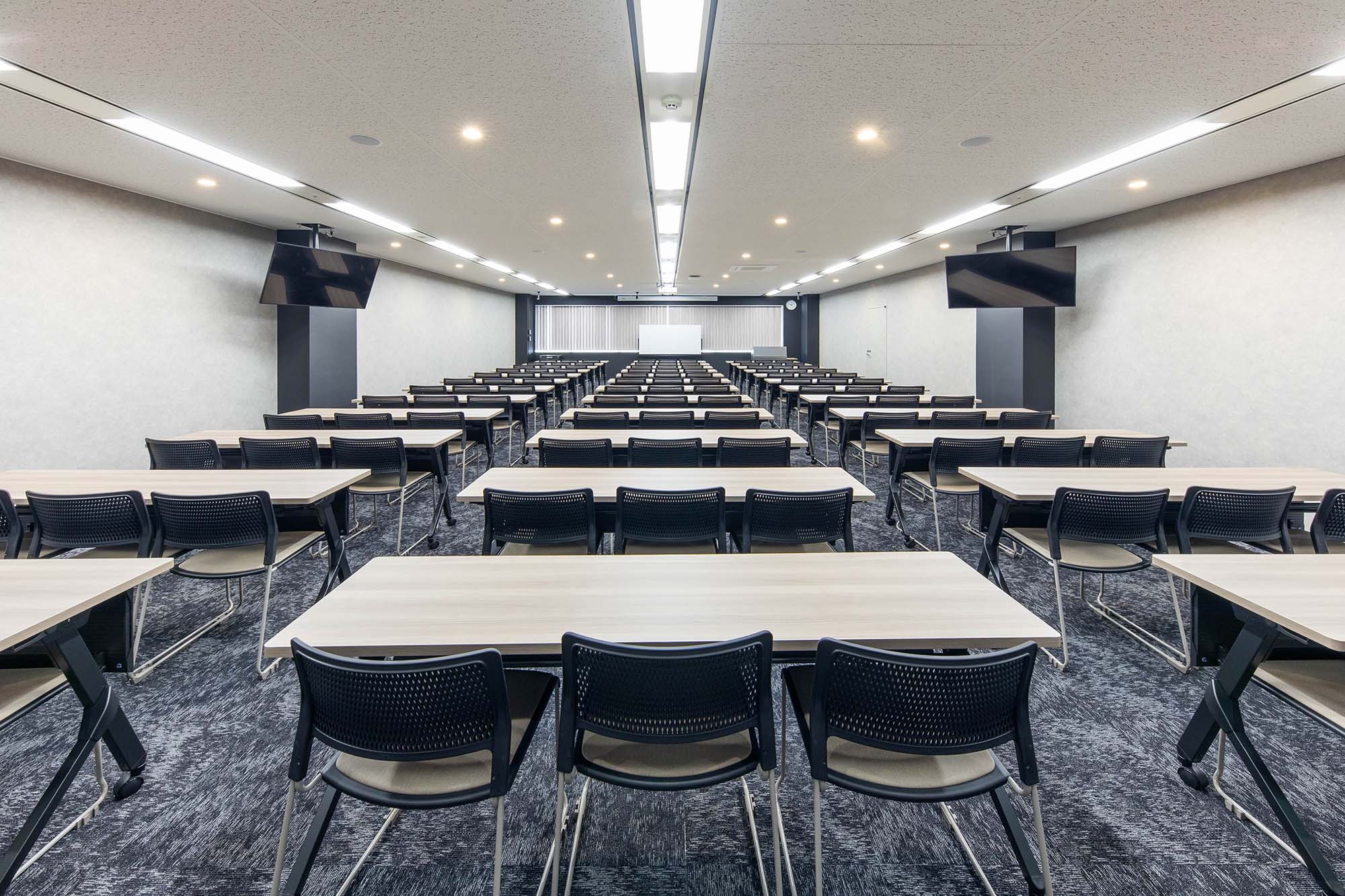スクール最大108名の会議室で、セミナーや研修・懇親会などあらゆるイベントにご利用いただけます。高性能な音響システムを搭載し、マイクや映像音声は天井内蔵スピーカーから会場全体に均一に行き渡ります。120インチの電動スクリーンと5200ルーメンの高輝度レーザープロジェクター、2台の天吊モニターを備え、視認性も抜群。(※有料オプション)登壇者の声や動画も臨場感たっぷりに伝わり、イベントの質を高めます。