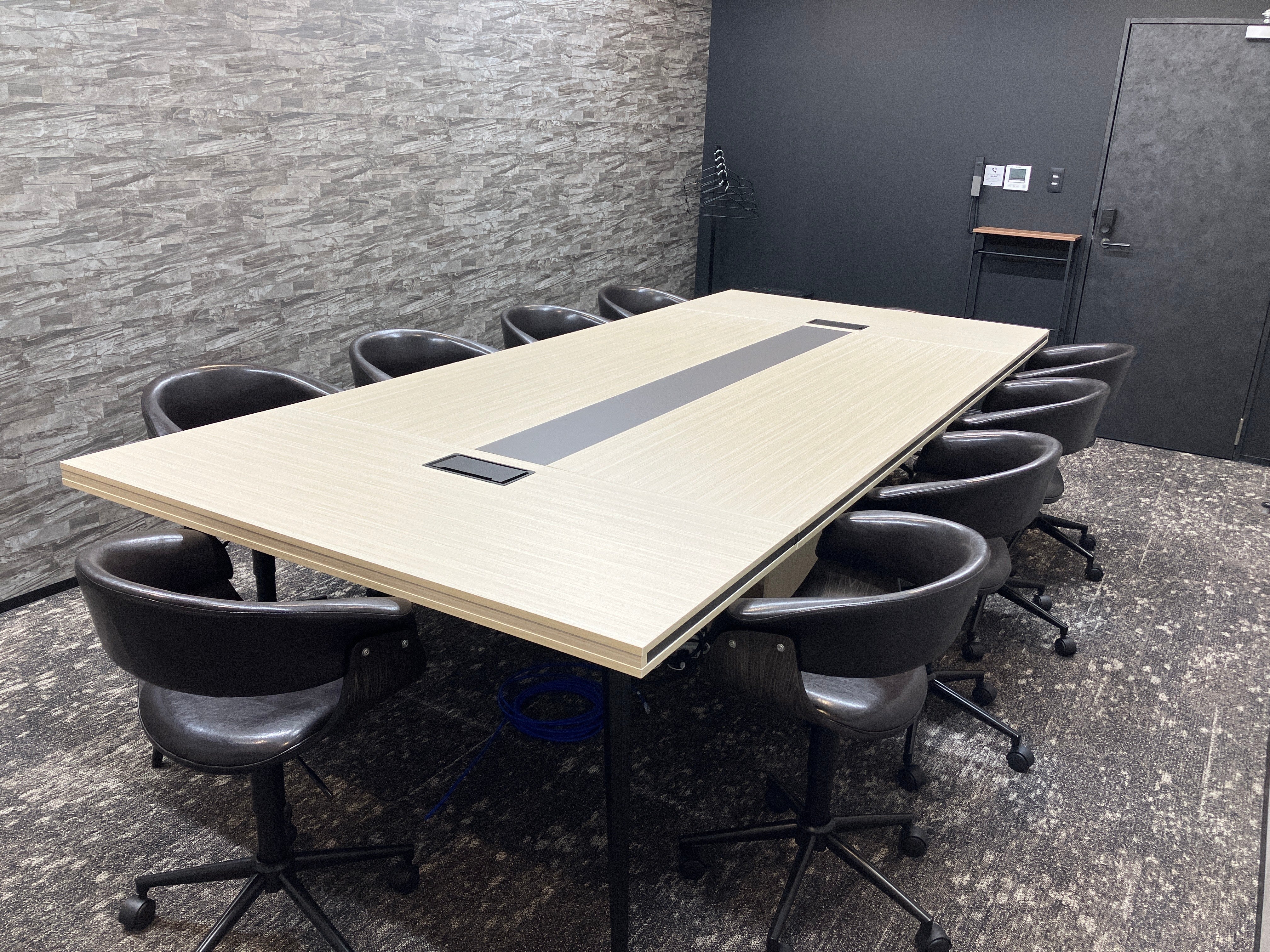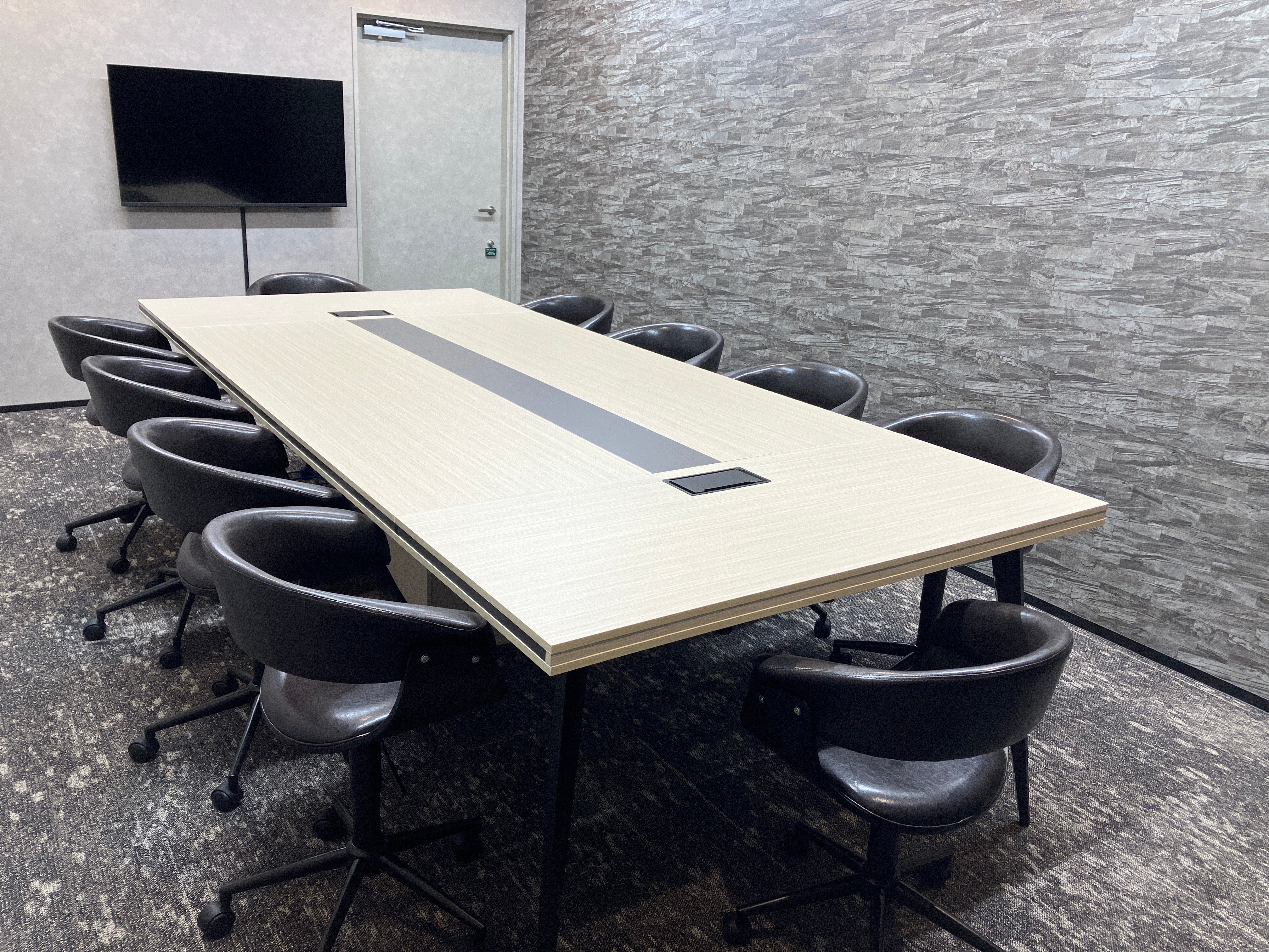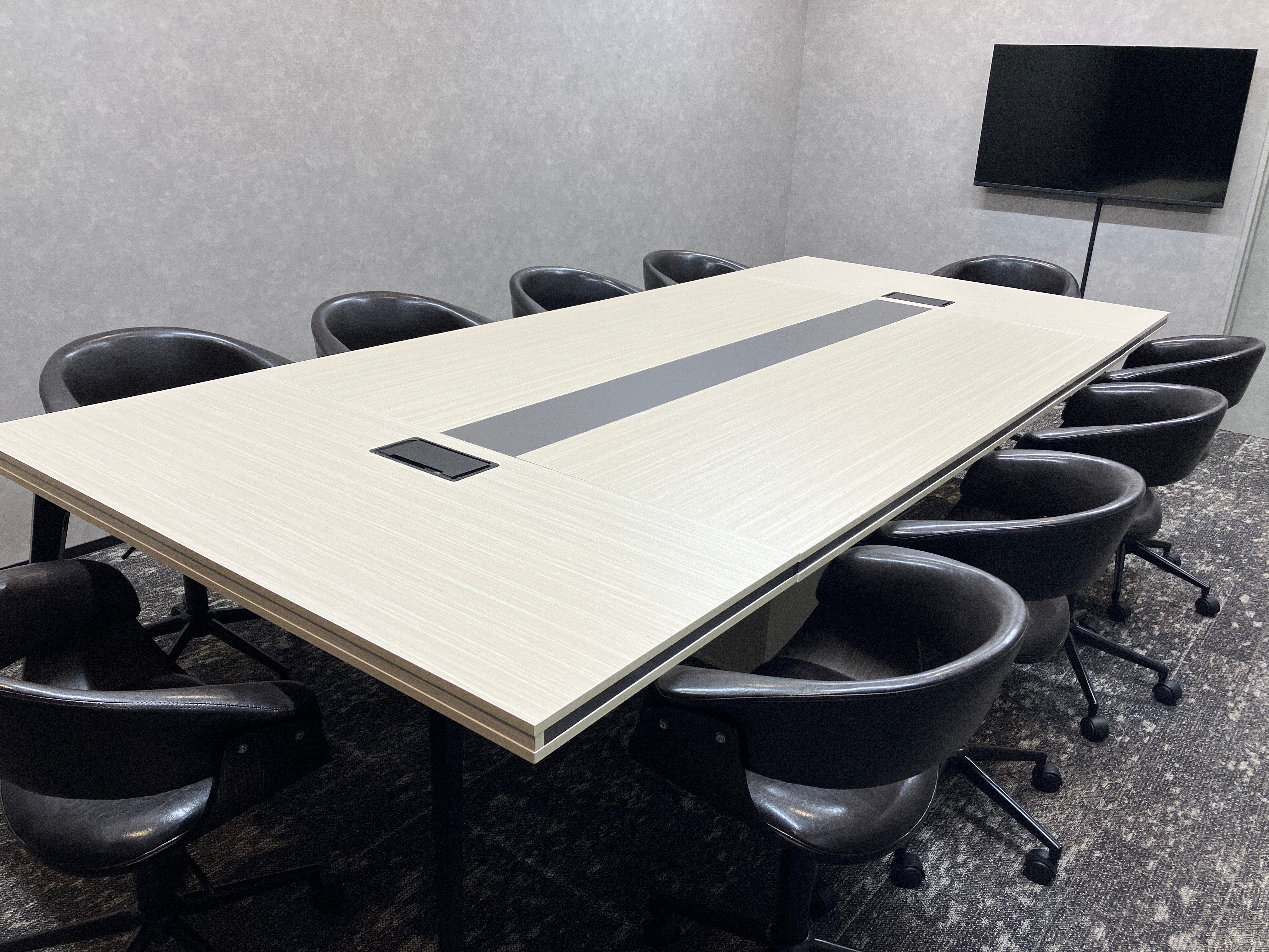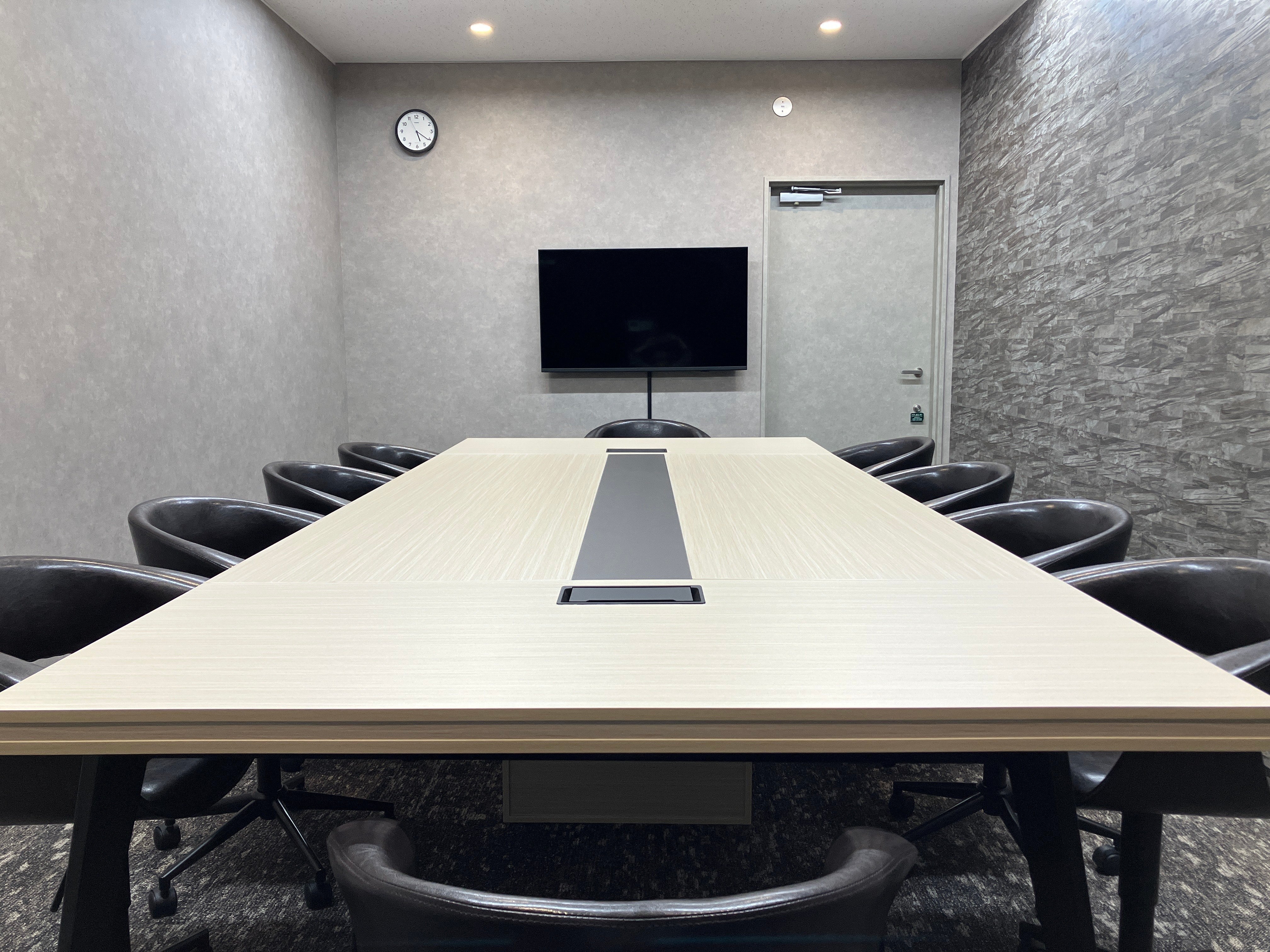 最スタイリッシュなグレーを基調とした明るく上質なミーティング空間。大きな会議テーブルと座り心地のチェアをご用意しています。室内には50型の液晶モニター付き。高速10G回線(有線・Wi-Fi)も無料で利用可能。PCを接続するだけでスムーズにオンライン会議やプレゼンテーションが開始できます。WEB配信やインタビュー、撮影利用にもおすすめ。ビジネスのあらゆるシーンに対応できるワンランク上の会議室です。