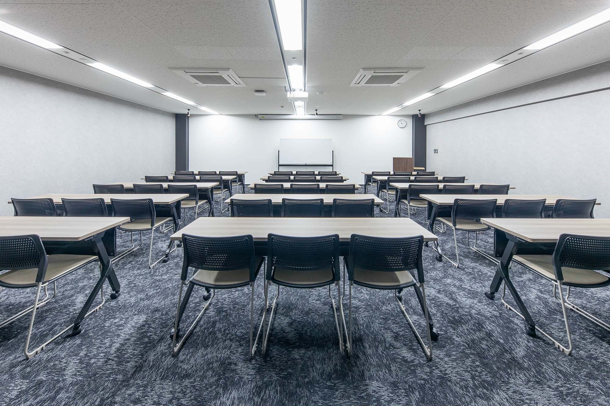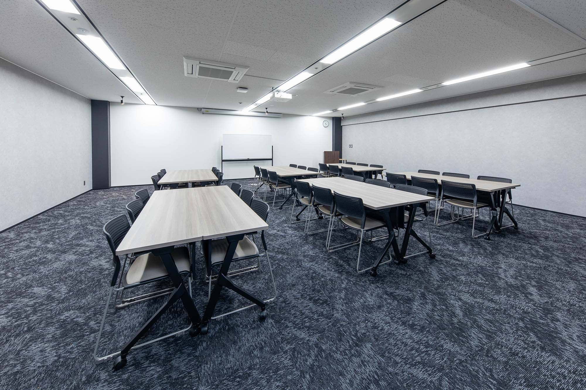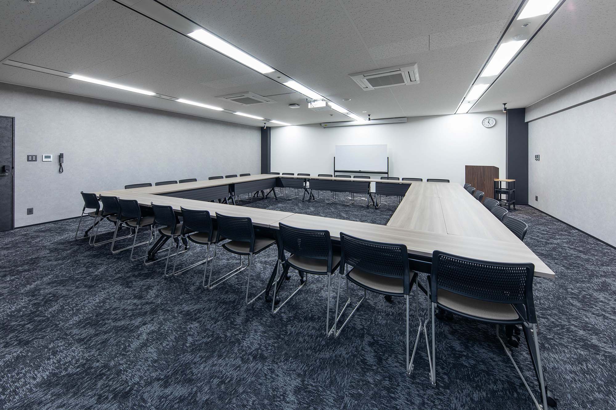 人気の高いミドルサイズの会議室。ビジネスユースはもちろん、異業種交流会やワークショップなど多目的なイベントにも対応可能です。シックなグレーカラーが、穏やかな空気感を演出。部屋前方にはプロジェクター投影用の特殊壁紙を採用し、壁投影でも高い視認性を実現。120インチの電動スクリーンと5200ルーメンのレーザープロジェクター(有料)も完備しており本格的なプレゼンテーションもスムーズに行えます。
