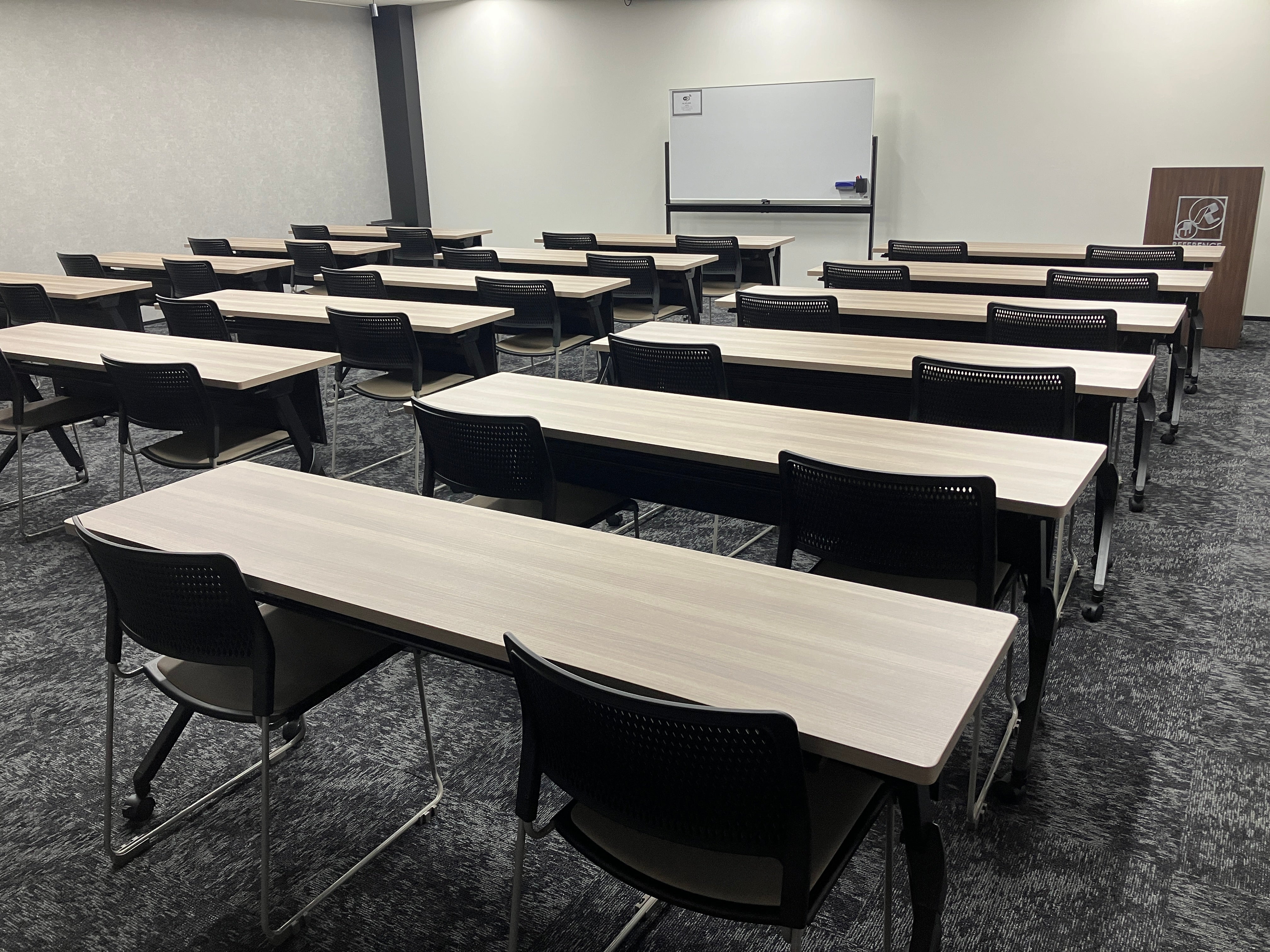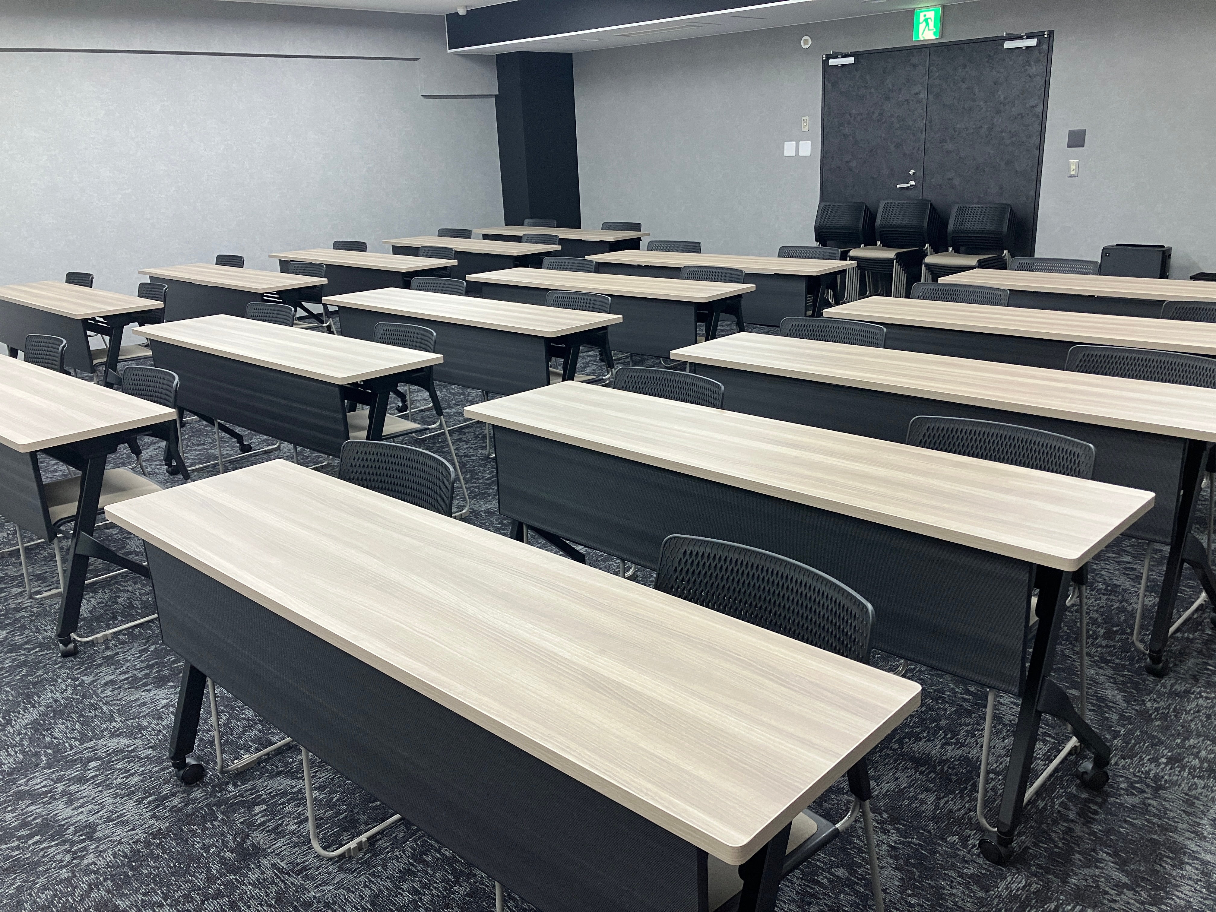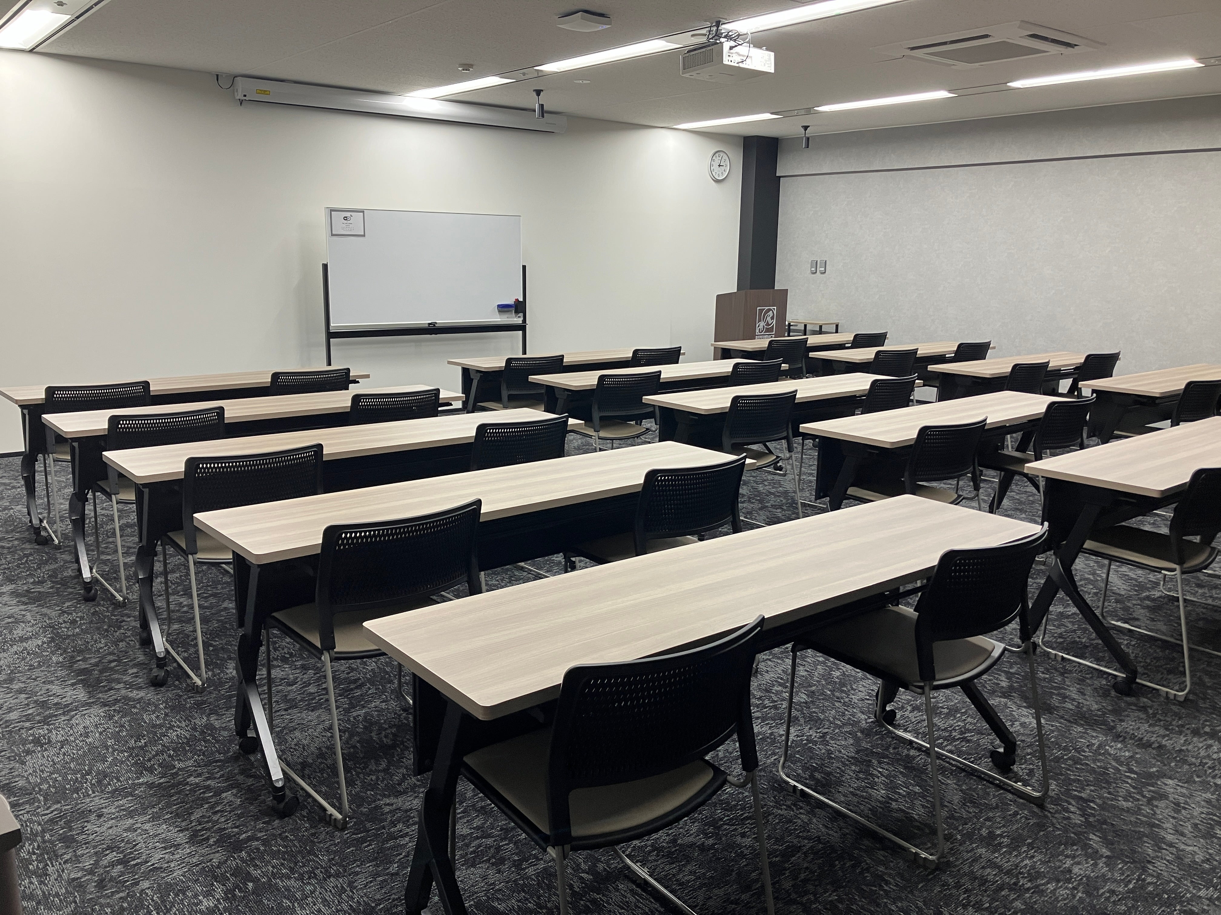 人気の高いミドルサイズの会議室。ビジネスユースはもちろん、異業種交流会やワークショップなど多目的なイベントにも対応可能です。シックなグレーカラーが、穏やかな空気感を演出。部屋前方にはプロジェクター投影用の特殊壁紙を採用し、壁投影でも高い視認性を実現。120インチの電動スクリーンと5200ルーメンのレーザープロジェクター(有料)も完備しており本格的なプレゼンテーションもスムーズに行えます。