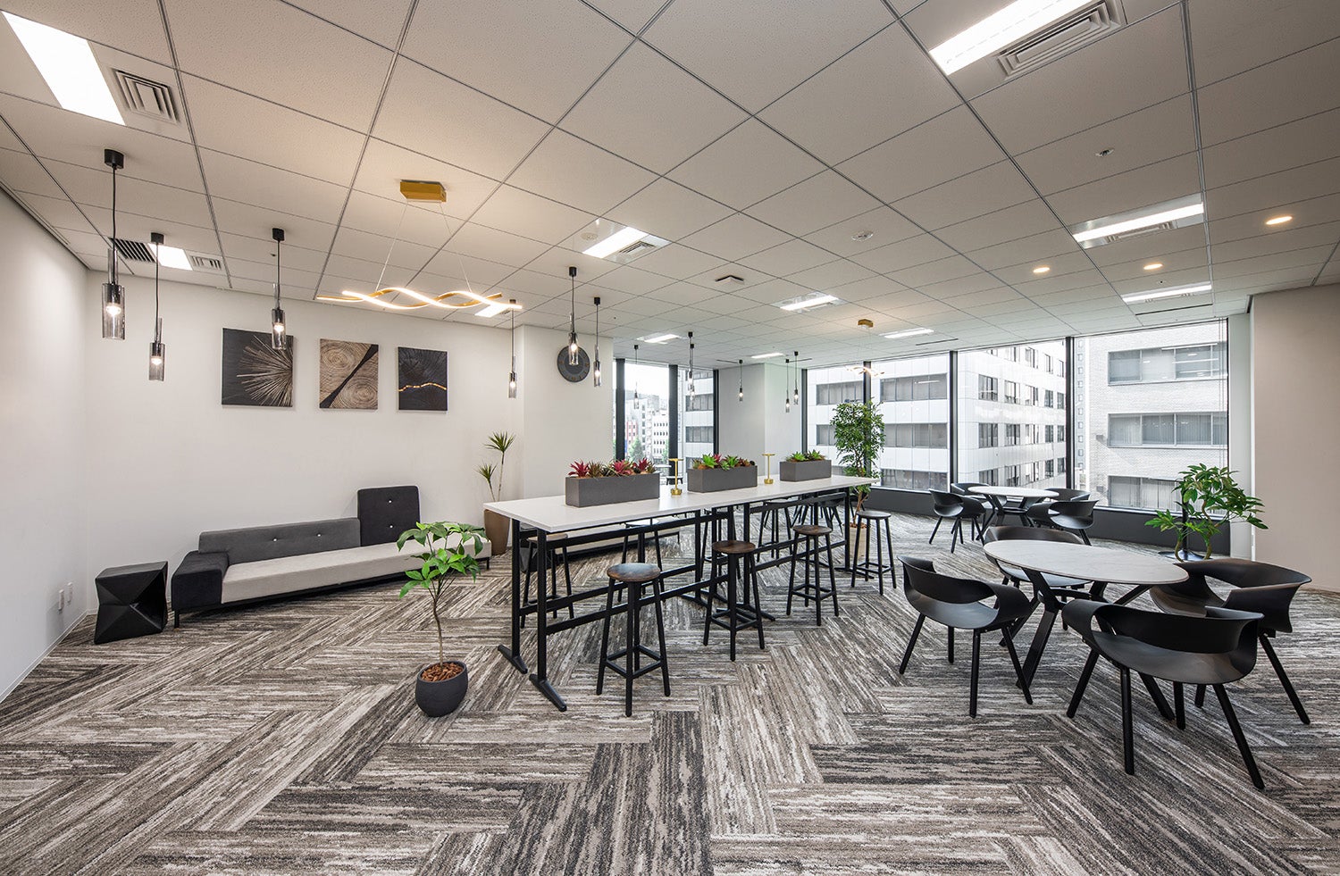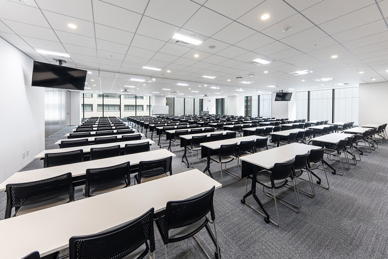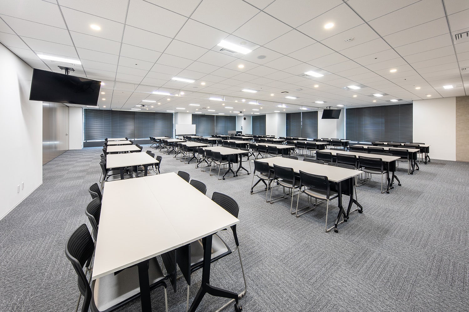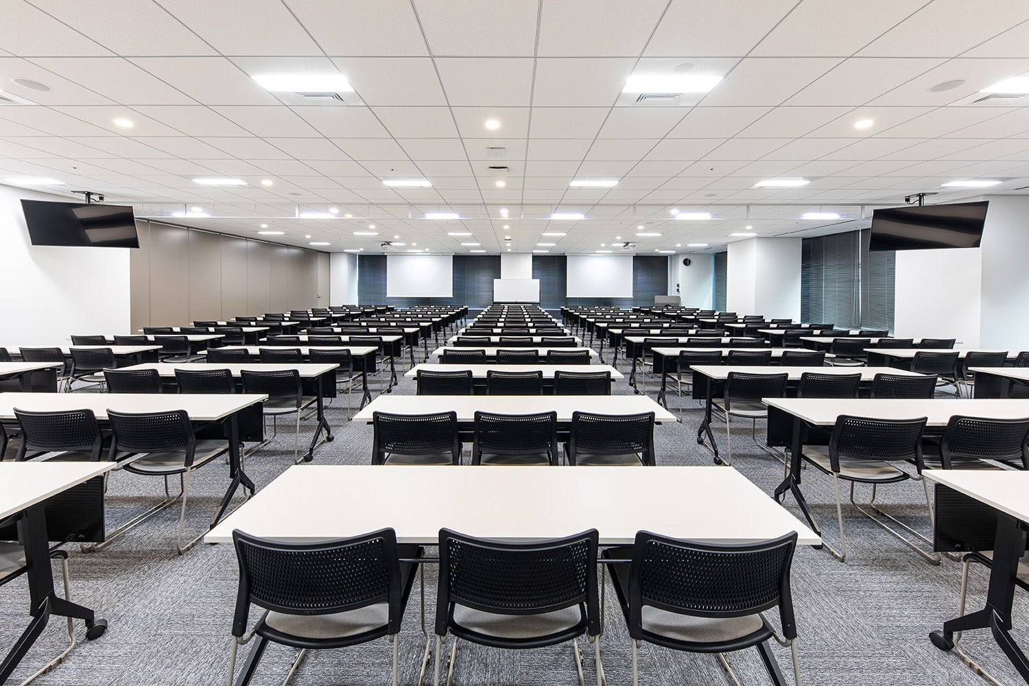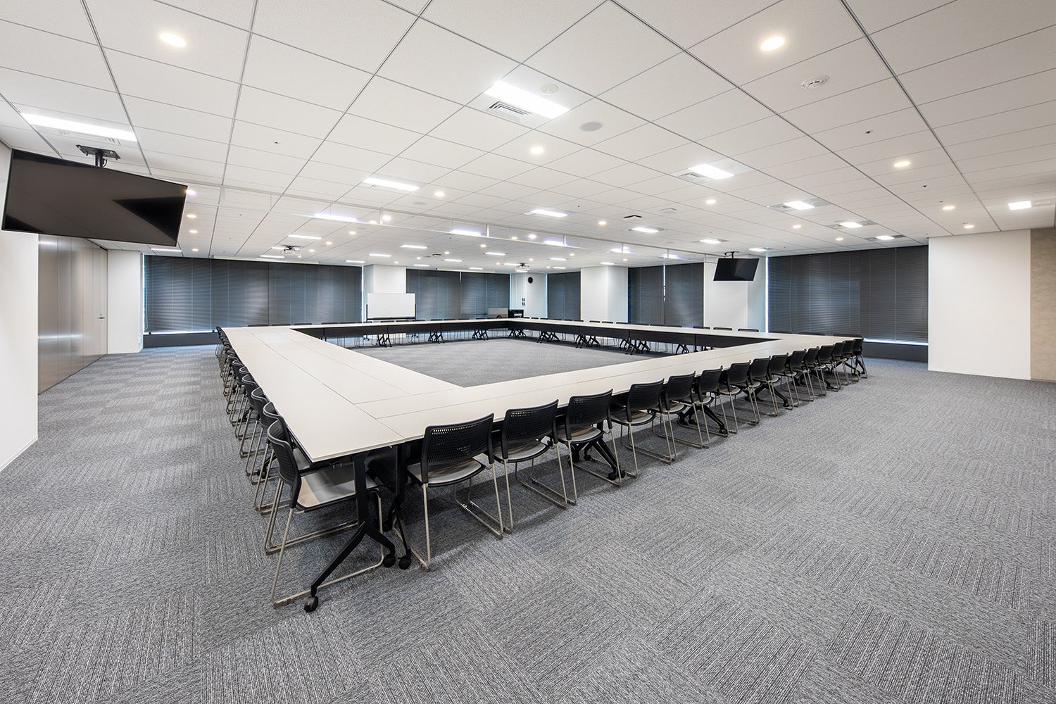 最大195名様まで収容可能な広々とした会議室。隣接する待合室を解放すればプライベート空間に。会議のブレイクタイムはもちろん、セミナー後の懇親会もスムーズに開催できます。 2面採光の明るい室内は、ゆったりと過ごせる開放感あふれるデザイン。最新の音響・映像設備を完備し、レーザープロジェクターが明るい環境下でも鮮明な映像を映し出します。WEBセミナーにも最適な当会議室