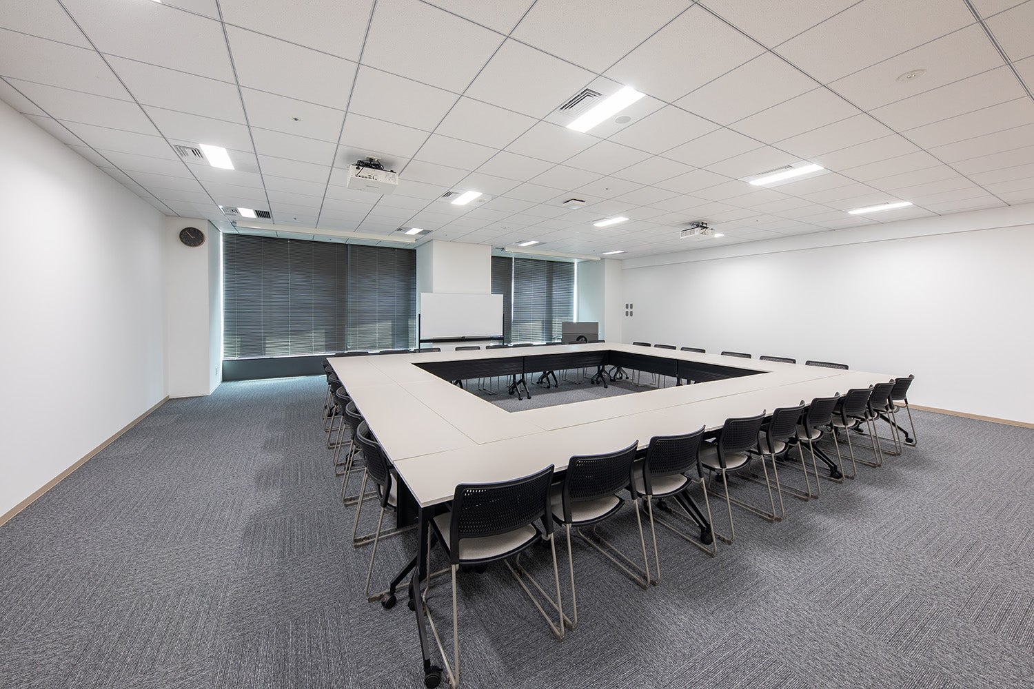 会議やグループディスカッションにも柔軟に対応します。 窓に面しているため明るく開放的な空間です 最新の音響・映像設備を完備し、レーザープロジェクターが明るい環境下でも鮮明な映像を映し出します。WEBセミナーにも最適な当会議室