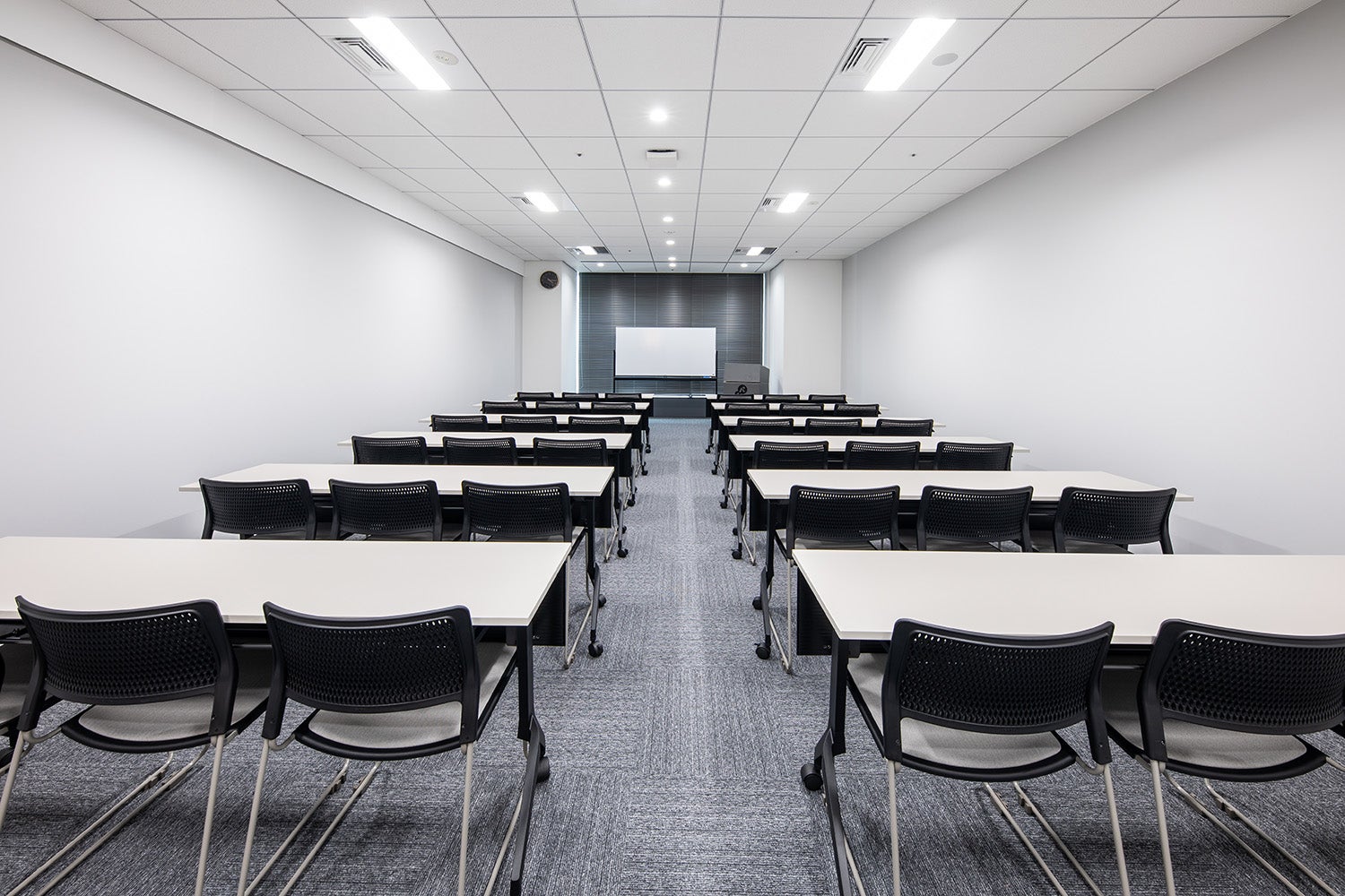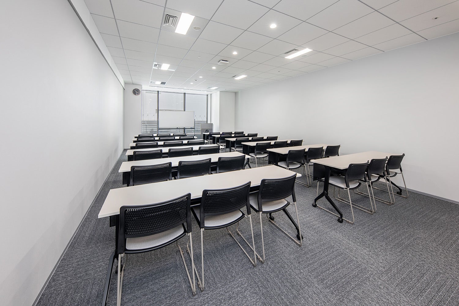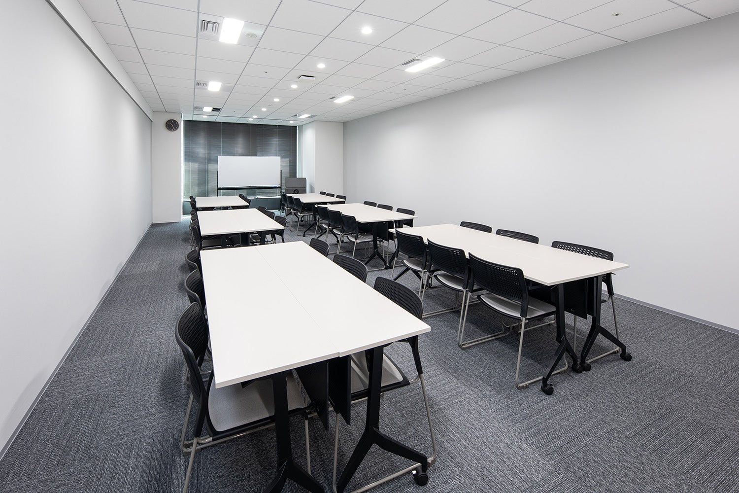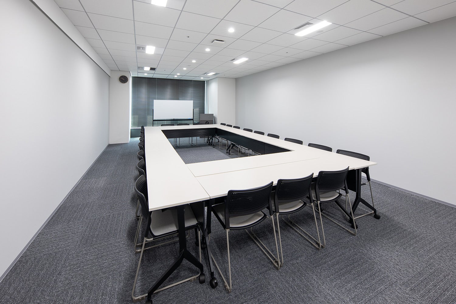 シンプルながらも機能性を備えた使い勝手の良いお部屋で、 面接や会議、社内研修など多目的に活用できる使いやすいサイズ感が特長です 前面が窓なので明るい会議室です