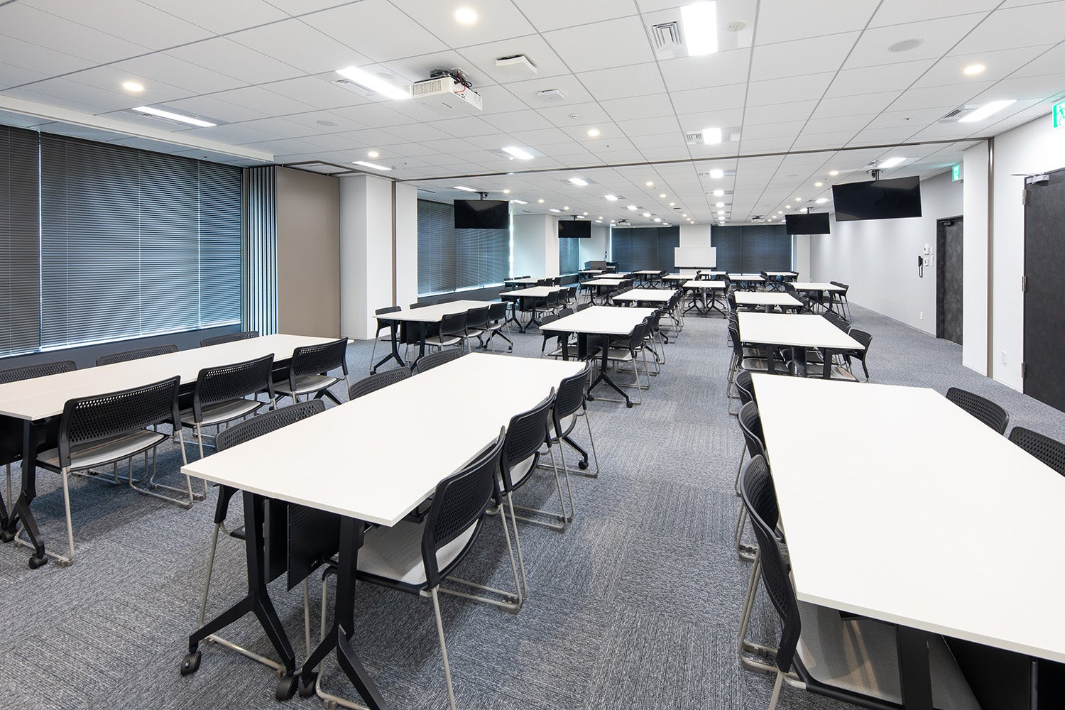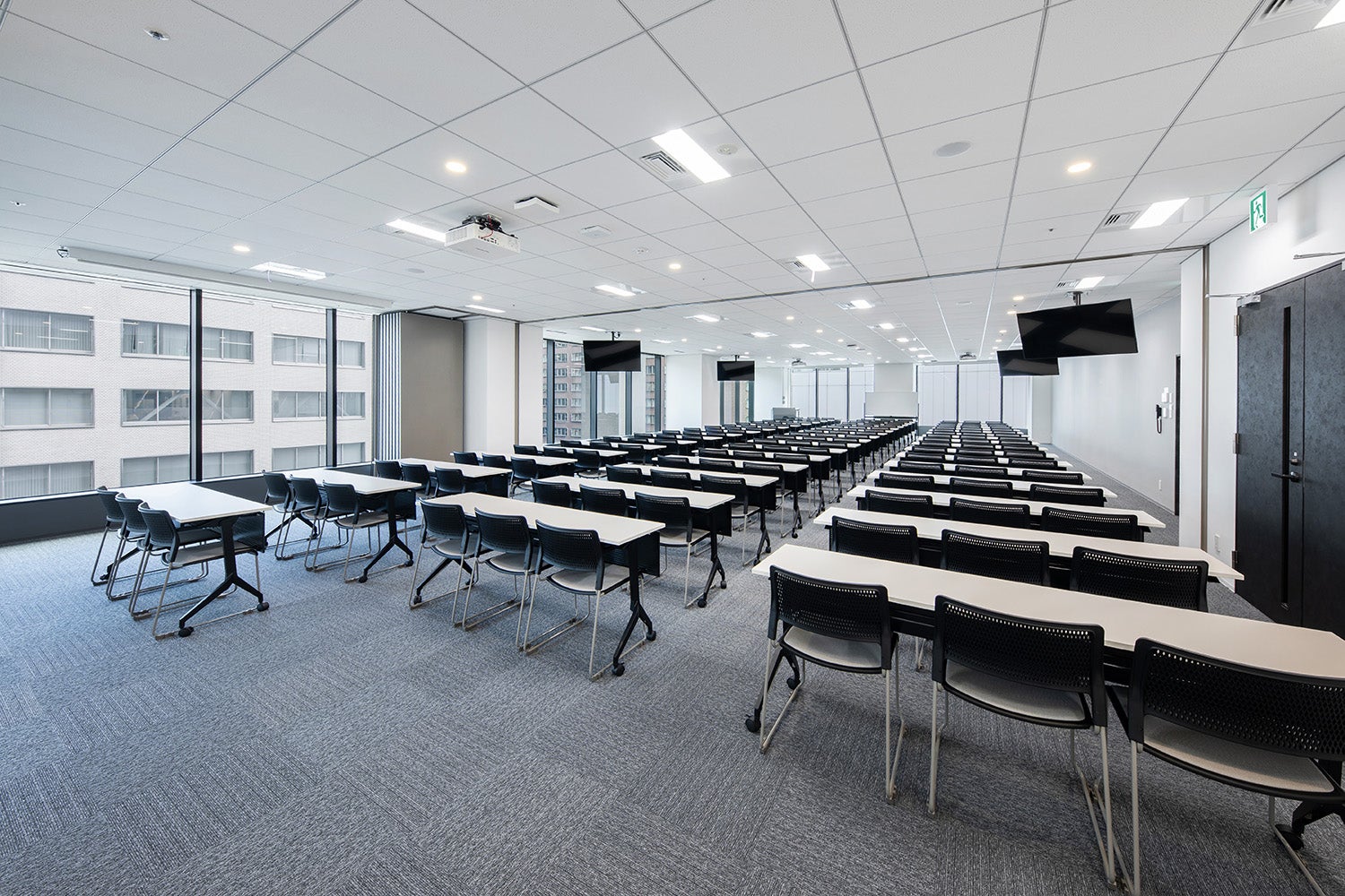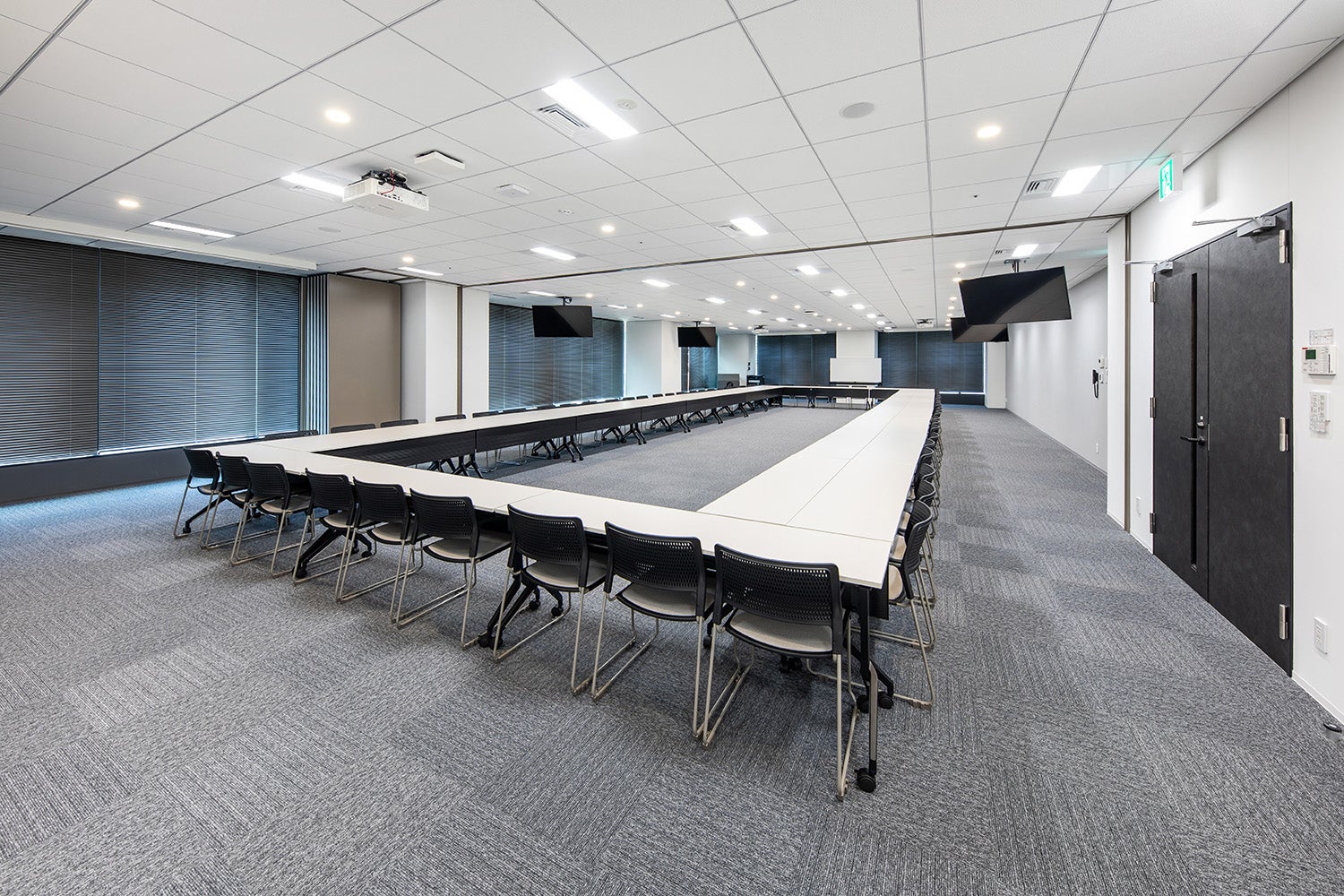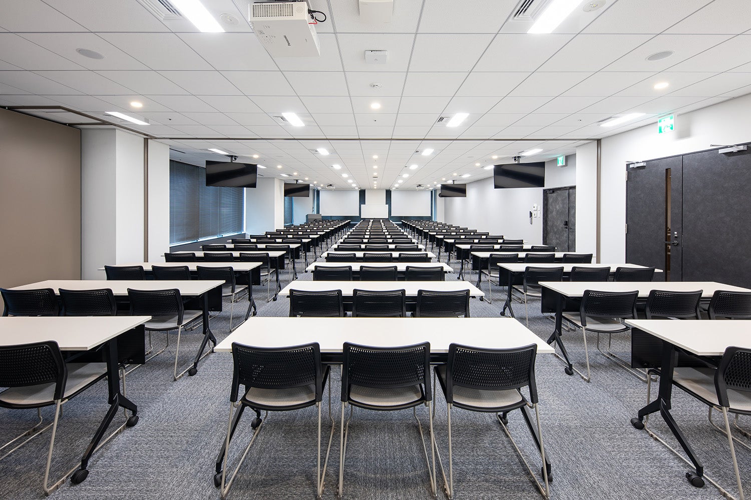 2面採光の明るく開放的な空間。高性能な音響システムを搭載しており、マイクや映像音声は天井に埋め込まれたスピーカーから会場全体に均一に行き渡り、どの席でもクリアに音声を届けます。パーティー、撮影、イベントなど、さまざまな用途でご利用いただける機能性とデザイン性を兼ね備えた多目的スペースです。