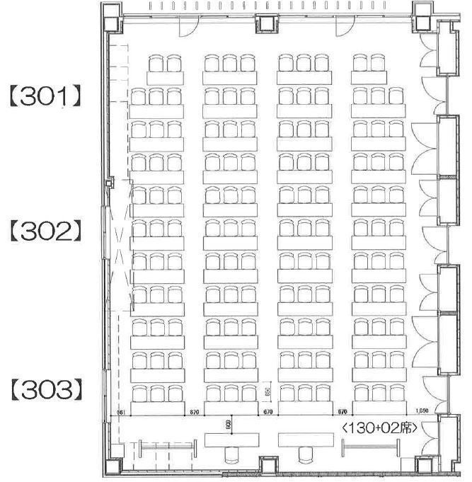 スケール形式で最大120名収容可能な会議室です(横4列×縦10列×3名掛け)