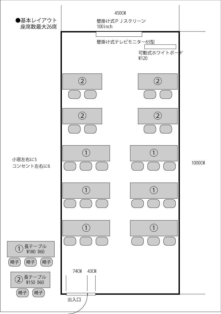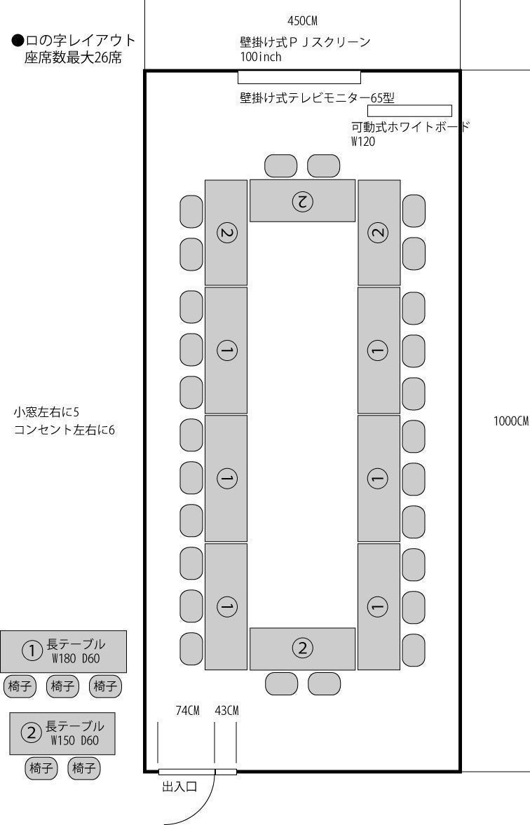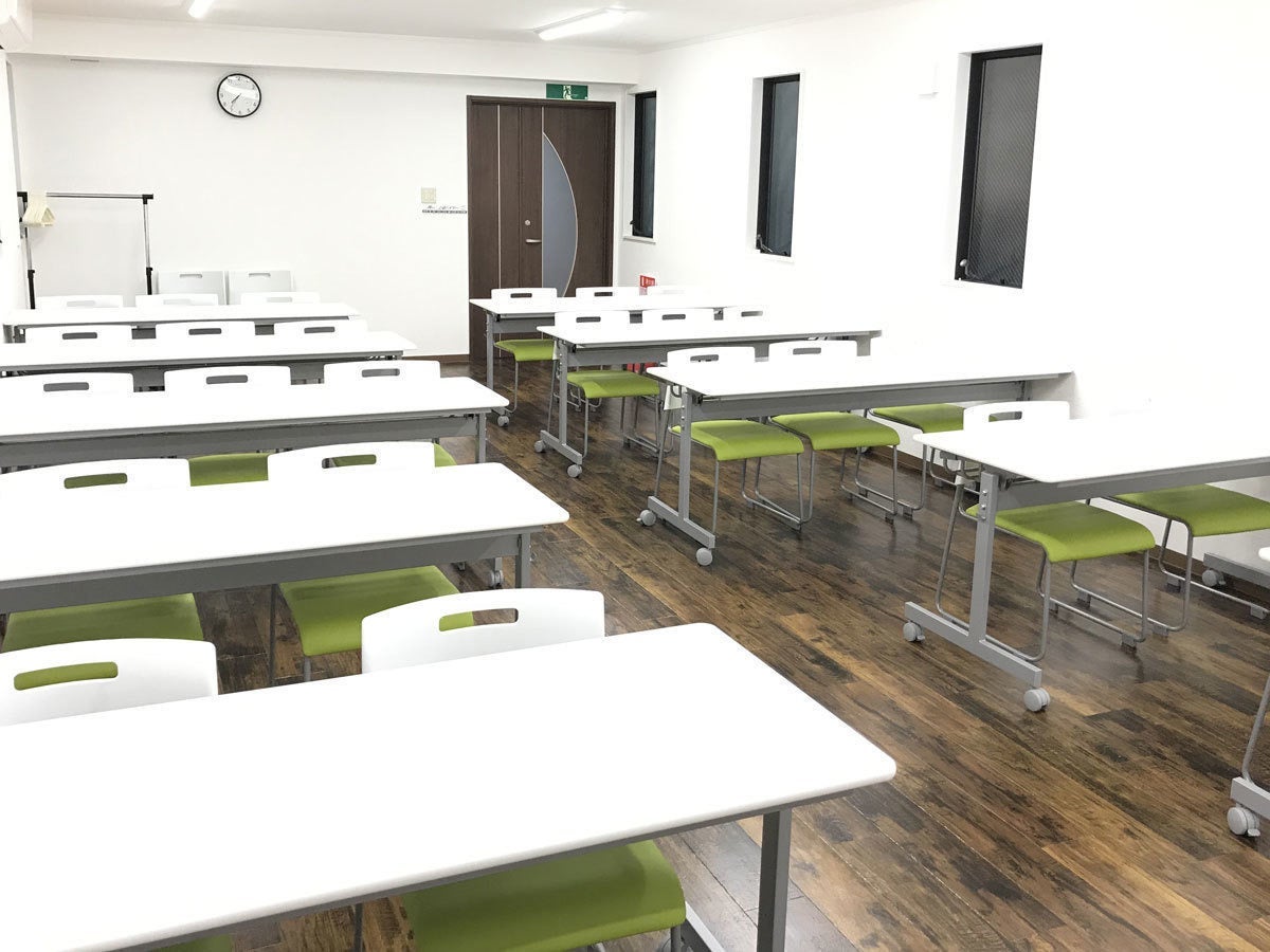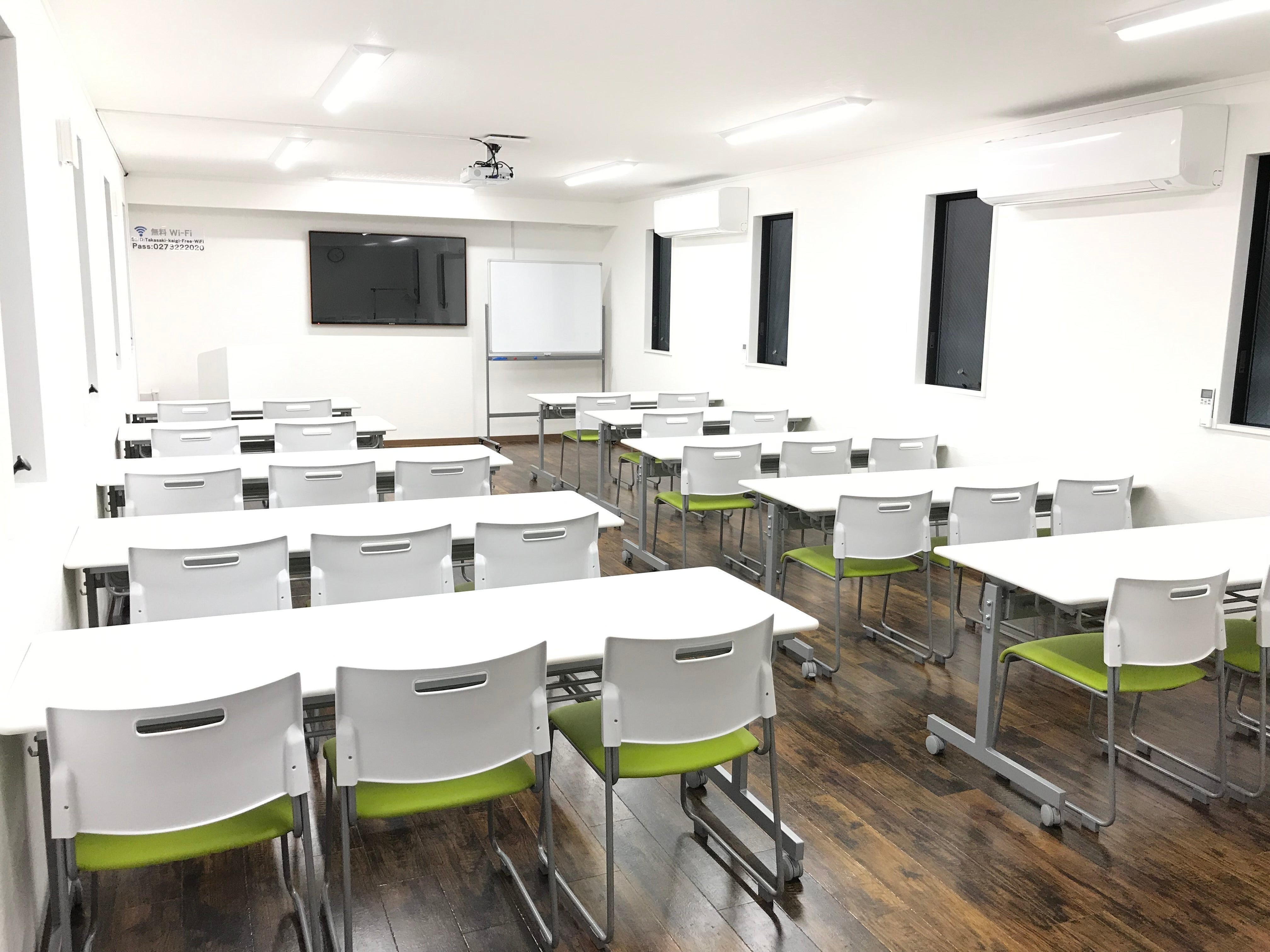 【貸し出し時間 7:00-22:00 土日祝もOK】 大人数の収容が可能となりますので、プレゼンテーションや研修会、大人数の会議、又は、セミナー、テスト試験会場等に最適です。 WiFiも完備しておりますので、ビジネスでのご利用にも適しております。 プロジェクター|Wi-Fi|ホワイトボード|消毒液|非接触式体温計|無料【窓有り】