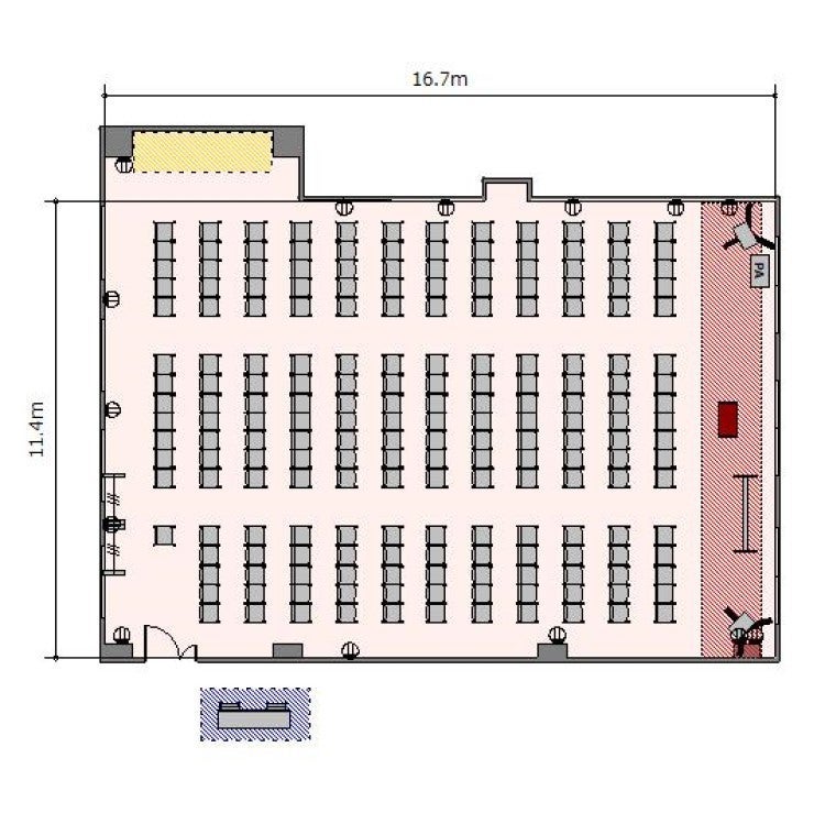 【備品】 テーブル:52イス:156 演台:1 ホワイトボード:1 ハンガーラック:1 有線マイク:2 掛け時計:1 電源タップ:5 【設備】 ダウンライト対応 個別空調 電気容量:15A×6系統 (機材使用状況・レイアウトによって変動有) LAN口数:2口 外受付:可 窓:あり 開閉可