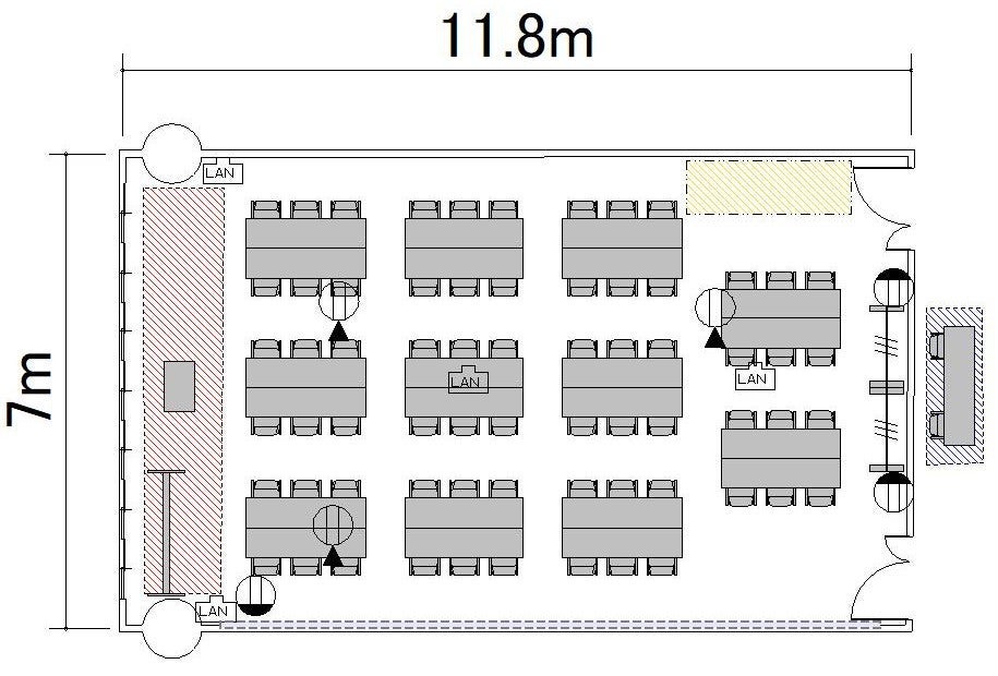 【備品】 テーブル:24 イス:72 演台:1 ホワイトボード:1 ハンガーラック:1 掛け時計:1 電源タップ:3 【設備】 ダウンライト対応 個別空調 電気容量:15A×3系統 (機材使用状況・レイアウトによって変動有) LAN口数:4口 外受付:可 窓:あり(開閉/不可) ※スクール形式の定員以上の机、椅子は追加料金が別途発生いたします。