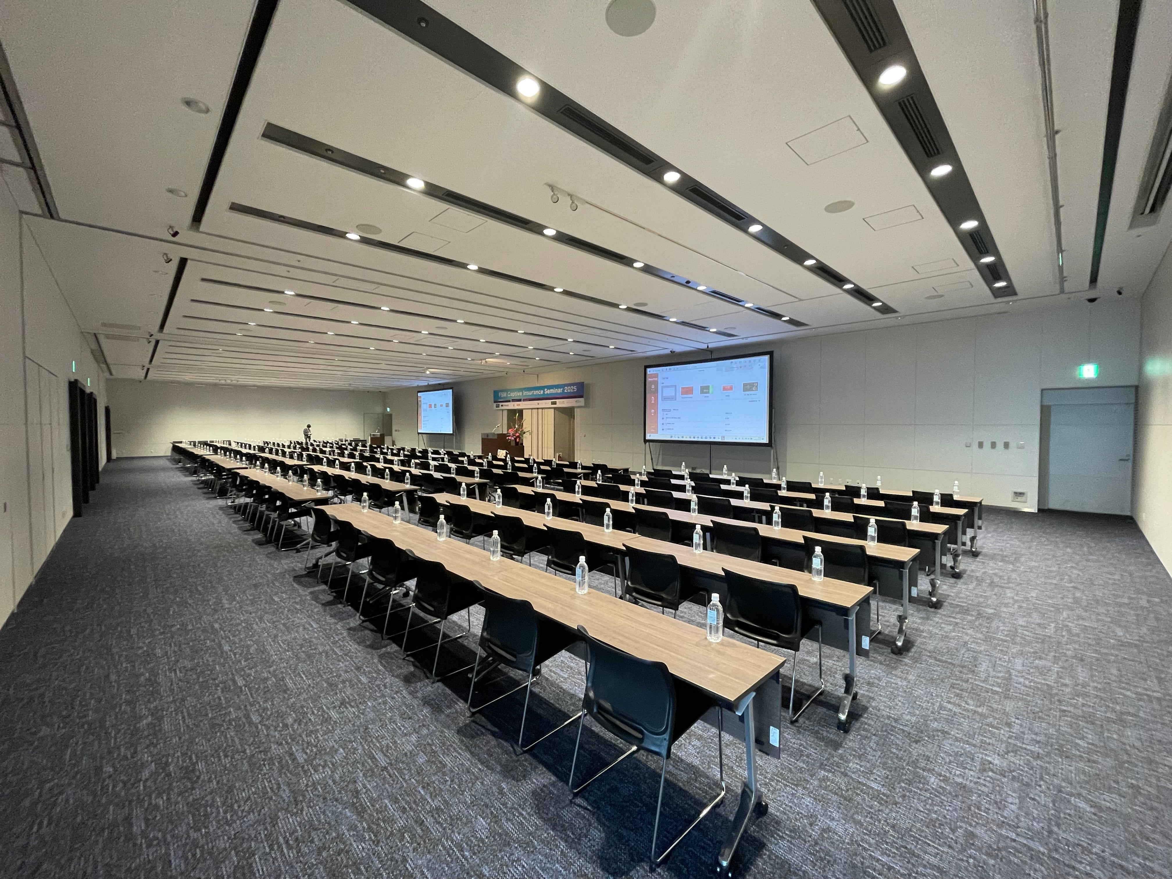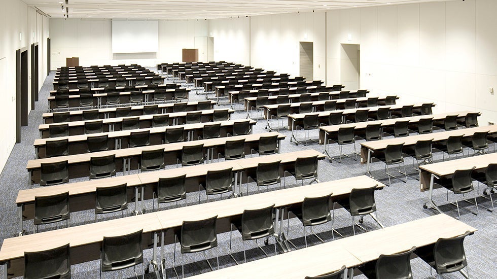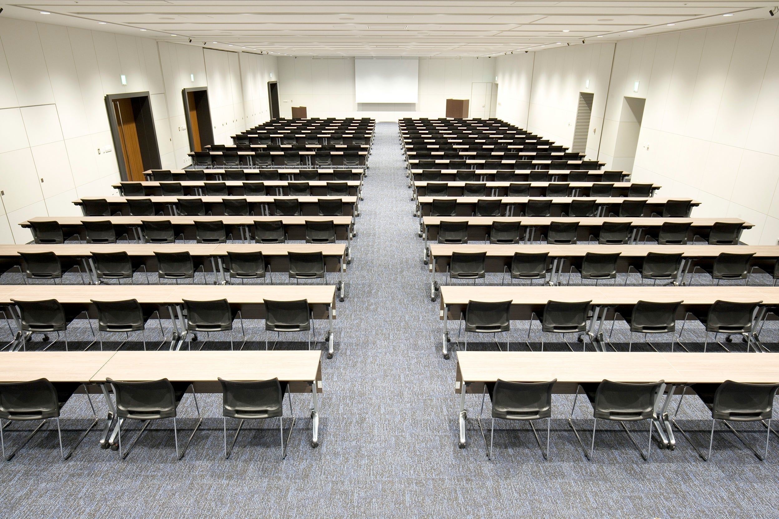 メインルームは最大4部屋の連結(470㎡)が可能な当施設最⼤の会場で、ご利⽤⼈数や⽤途にあわせ、連結・分割ができます。300名の⽴⾷パーティや、約500名のシアター形式のセミナーまで、様々なご利⽤が可能。濃紺の絨毯と⽩で統⼀された天井と防⾳壁に加え、⾼品質のカンファレンス専⽤のデスクとチェアを配置。参加者さまが、⻑時間のセミナーや会議にもお疲れにならず、集中していただける空間です。