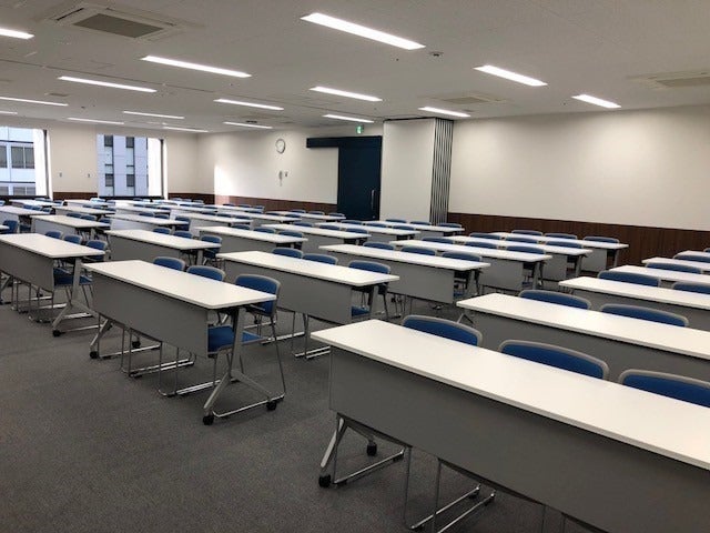 基本収容人数 108人(スクール形式)最大収容人数 200人(スアター形式) スクール形式で約165名の貸会議室が1時間あたり14,000円から利用可能! 講演会、会議、セミナーなどの他、試験会場にもご利用ください。