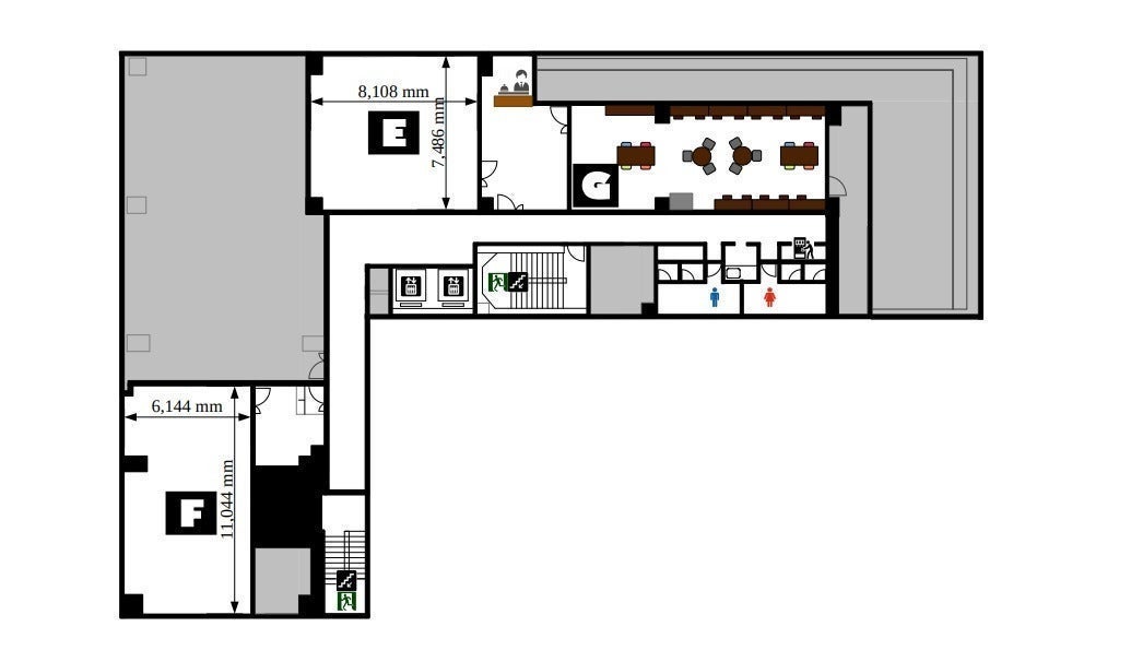 おすすめ用途 | イベントスペース、オンライン配信など 机椅子固定:20席(4名掛け×2テーブル+12席) |