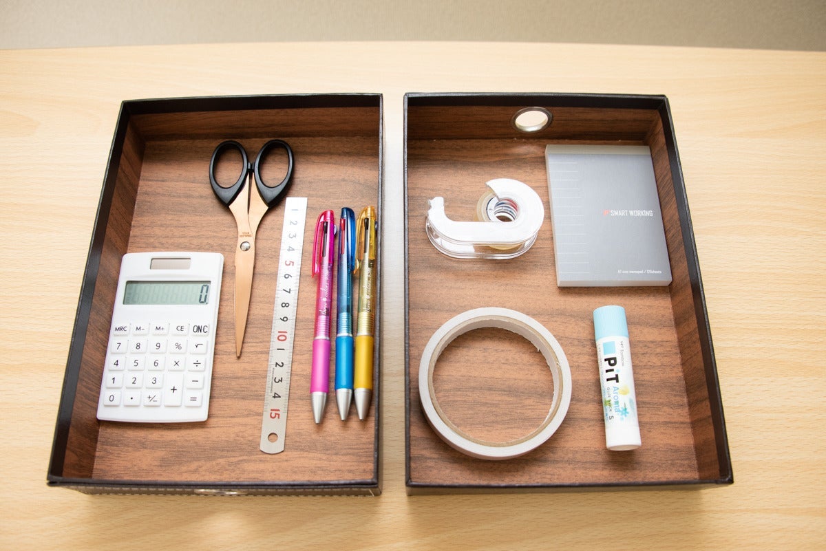 ペン、計算機、セロテープ、のり、メモ帳、ハサミ