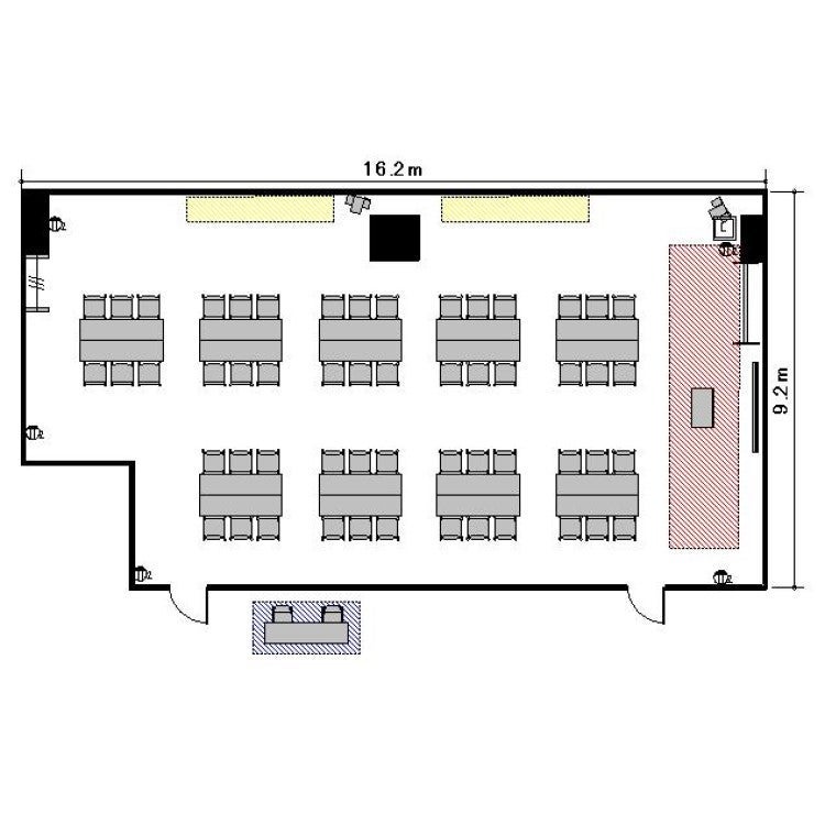 【備品】テーブル:26 イス:78 演台:1 ホワイトボード:1 【設備】 個別空調 電気容量:40A LAN口数:2 【室外受付設置】 可