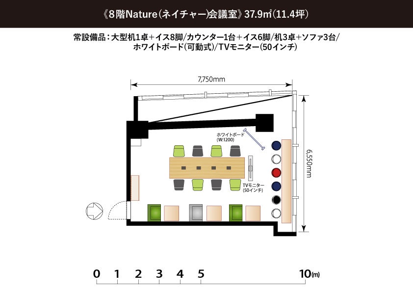 <37.9㎡11.4坪/収容人数 17名> 常設備品:50インチモニター ホワイトボード(W:1200 可動式) 【インターネット完備】