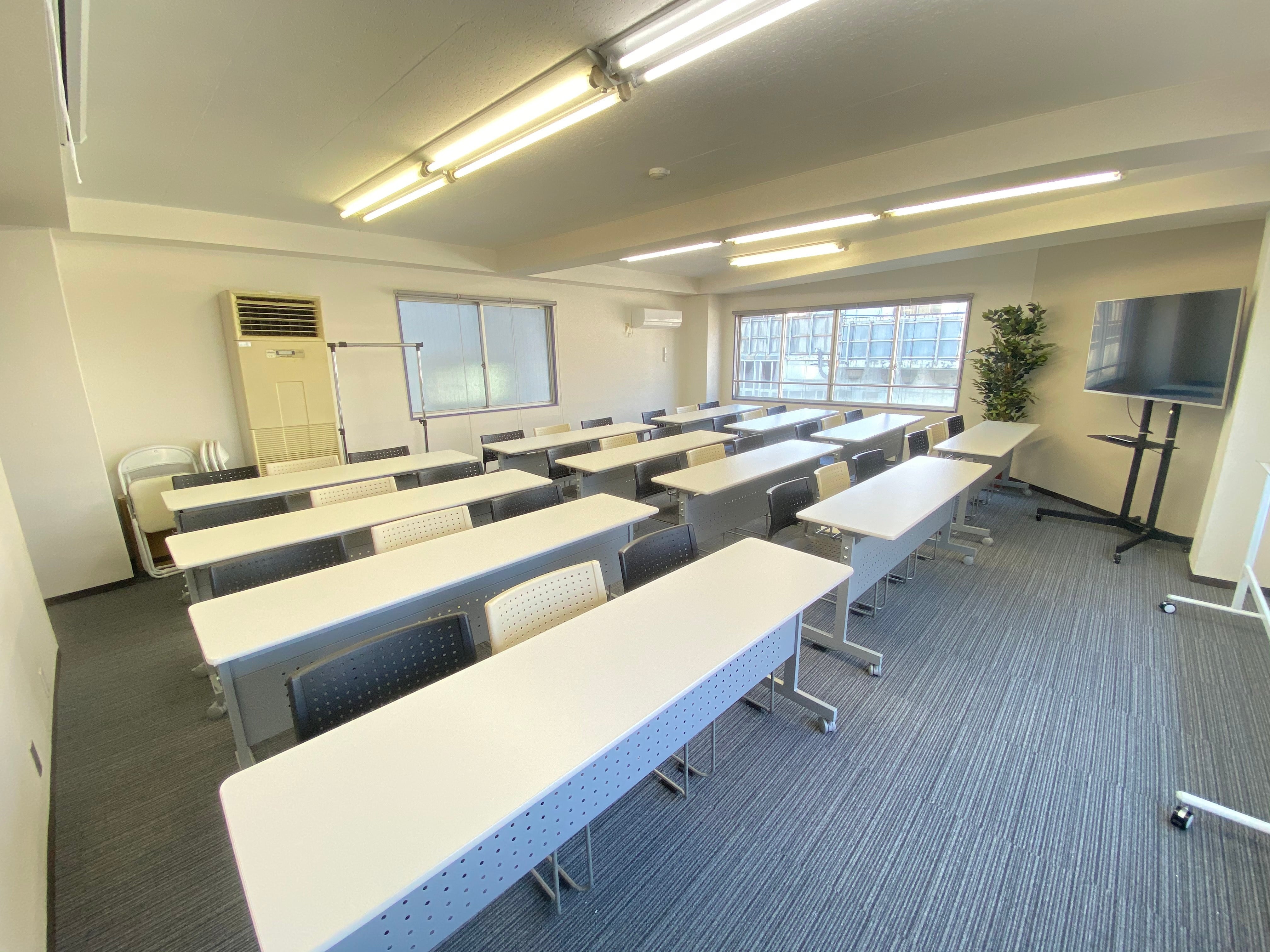 ■無料備品設備 ・高速インターネット(下り775.0/上り77.1) ・55インチ大型モニター ・演台、有線マイク ・ホワイトボード(180×90) ・テーブル(180×45(3人掛け))12台 ・イス42脚 ・プロジェクター(Epson EB-1910) ・プロジェクタースクリーン(2440×1830) ■長期予約ご相談ください