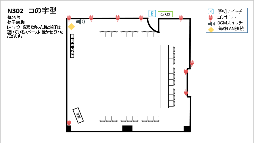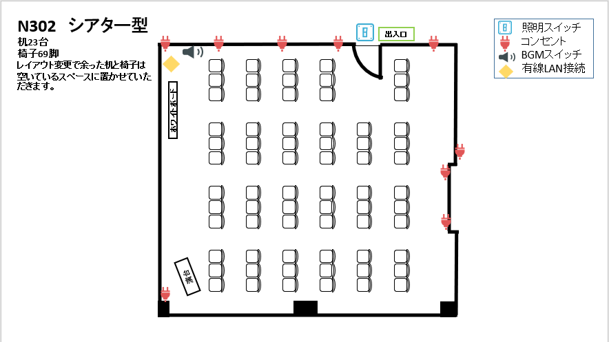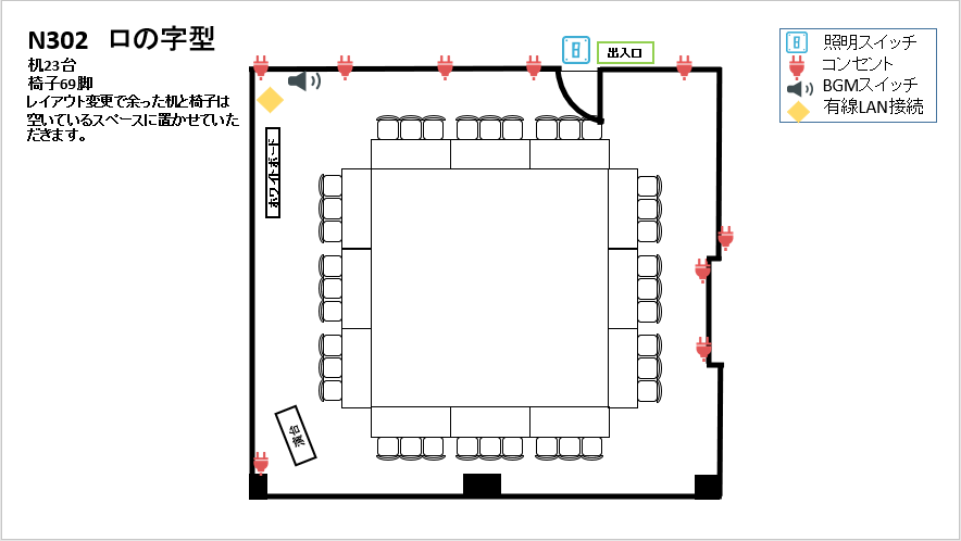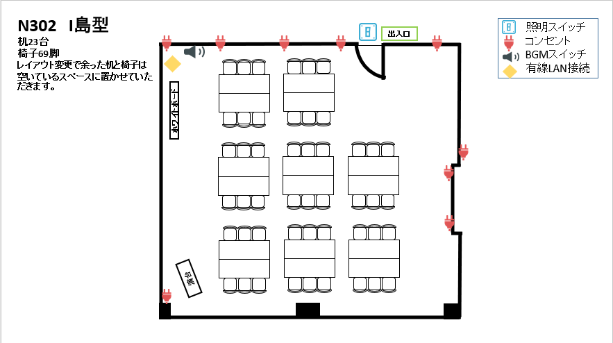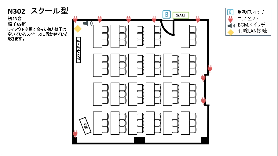 | おすすめ用途 | 会議、セミナー、研修・勉強会、会社説明会、採用試験会場、懇親会、ワークショップ、展示会、販売会、ロケ・インタビュー撮影などにおすすめです! |