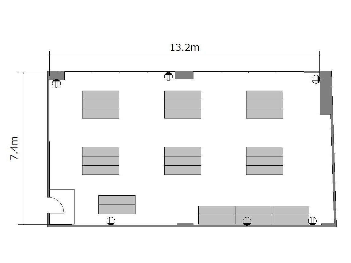 設備・備品 テーブル:32 椅子:96 演台:1 ホワイトボード:1 ハンガーラック:1 掛け時計:1 電源タップ:3 ※スクール形式の定員以上の机、椅子は追加料金が別途発生いたします。 個別空調 電気容量:15A×5系統 (機材使用状況・レイアウトによって変動有) LAN口数:共有1口/単独1口 外受付:不可 窓:あり 開閉可